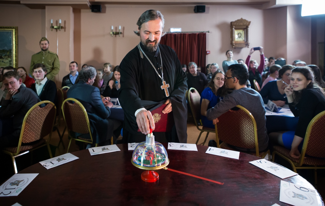 Программа соревнований состояла из трёх раундов с вопросами возрастающей сложности. Почетное право первого запуска волчка, определяющего номера вопросов, было предоставлено настоятелю нашего храма, протоиерею Андрею Алексееву, после чего звук гонга возвестил об оглашении первого вопроса. Размышляя над конкурсными заданиями, игроки – как молодые интеллектуалы, так и умудренные жизненным опытом знатоки, – демонстрировали завидную эрудицию, смекалку, находчивость, командный дух, а иногда – и прекрасное чувство юмора! И вместе с ними все присутствующие в зале вновь и вновь вспоминали страницы великой войны и Великой Победы.