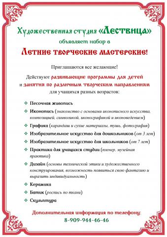 Художественная студия «Лествица» объявляет набор в Летние творческие мастерские!