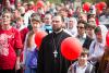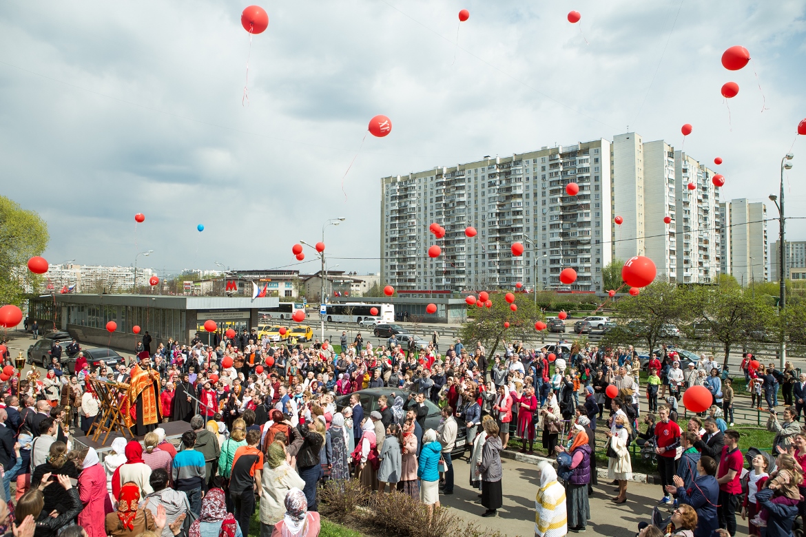 Яркая процессия, радующая глаз праздничными одеждами всех оттенков красного и алыми воздушными шарами с пасхальной символикой, парящими над головами идущих, под ликующее пение пасхального тропаря и восклицания «Христос Воскресе! – Воистину Воскресе!» прошла от храма святого благоверного великого князя Дмитрия Донского к посвящённому святому князю памятному камню возле метро.