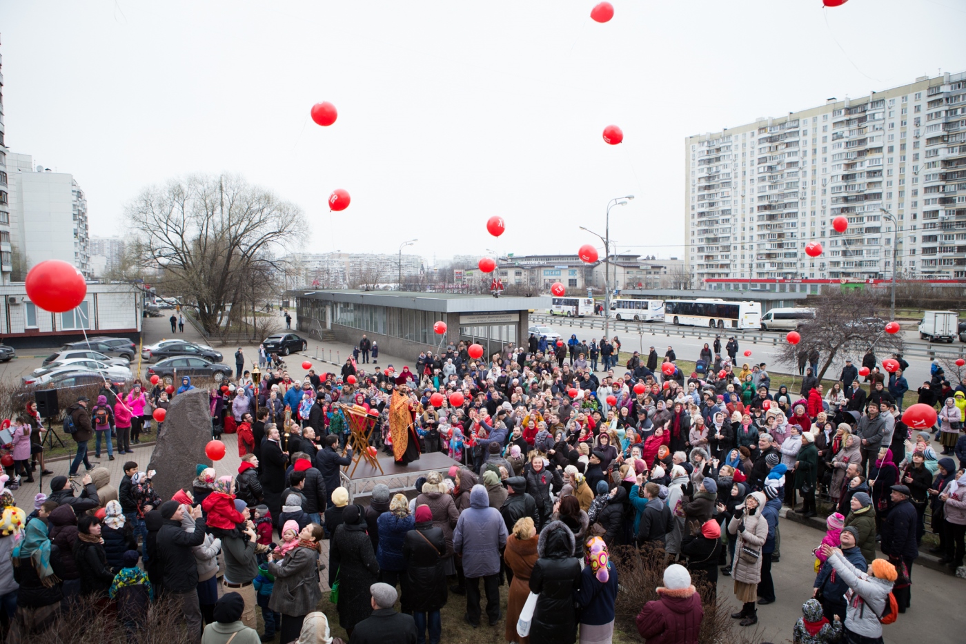 А вот – это уже после отслуженного у камня благодарственного молебна, во время приветственного слова к жителям района настоятеля храма, протоиерея Андрея Алексеева, – пожилой мужчина, вышедший из метро и присоединившийся к зрителям, смущённо смахивает ладонью то и дело набегающие на глаза непрошеные слёзы… В этом поздравительном пасхальном слове отец Андрей напомнил присутствующим о том, что любовь Бога к людям – это первооснова жизни, неиссякаемый источник нашей любви – к Родине, любому человеку как образу Божию, к своим семьям – и пожелал всем хранить в сердце пасхальную радость и щедро делиться ею.