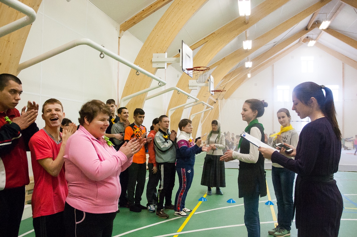 Далее все мы проследовали в наш спортивный комплекс для участия в спортивно-развлекательной игре «Весёлые старты», и вот здесь-то дети нам преподали самый важный урок! Воспитанники ДДИ обладают очень разными физическими и умственными способностями: у одних быстро и чётко всё получается, а другие выполняют с большим трудом даже самые простые действия. Ещё на колокольне стало заметно, что из групп, которые поднимались звонить, часть деток чётко попадали в заданный ритм, а часть выбивались из него, при этом остальные всячески поддерживали своих собратьев, помогали им. Нетрудно представить, как в таких ситуациях поступили бы обычные дети (про взрослых даже и не говорим). Этаже взаимная поддержка, терпение друг ко другу и помощь проявились в игре «Весёлые старты».