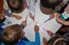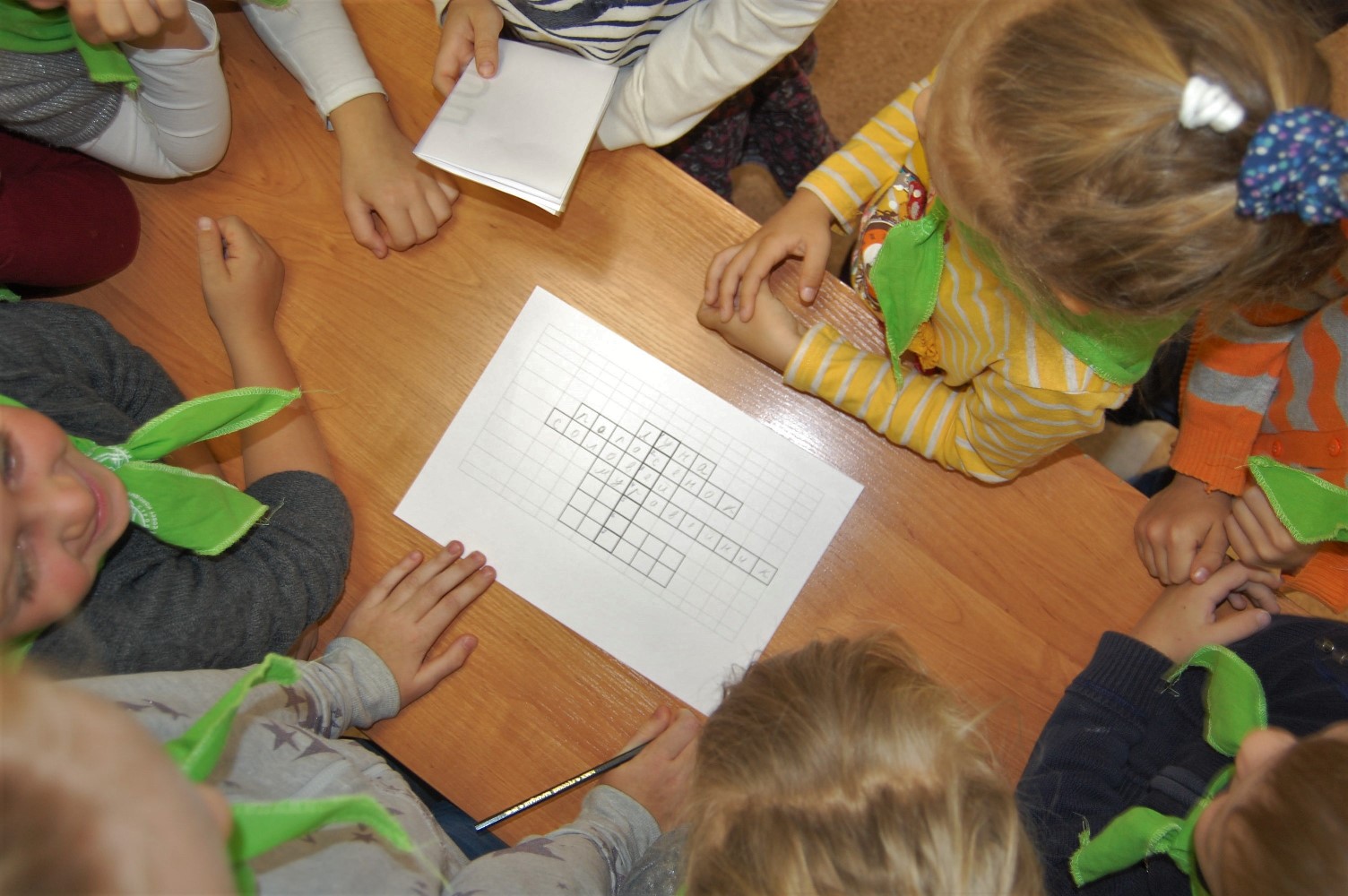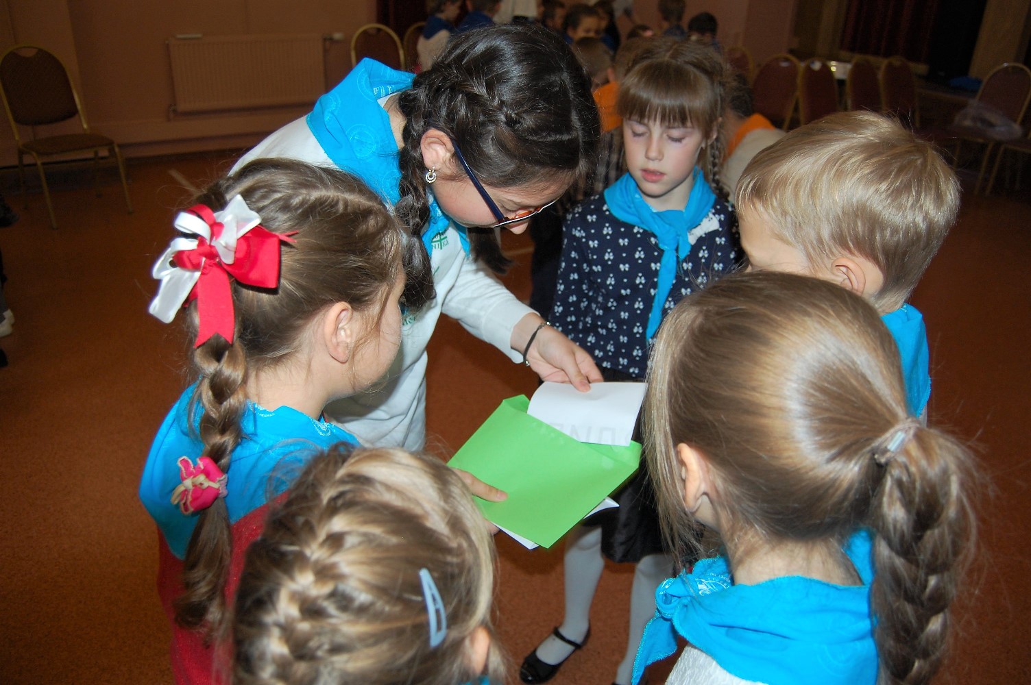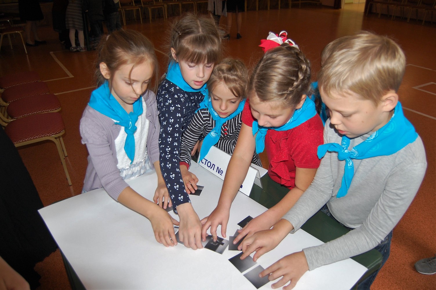 Вскоре все уже были заняты важным и интересным делом (включая меня: я старался одновременно находиться везде, чтобы заснять всё происходящее). Команды путешествовали по разным станциям, расположенным в пространстве школьного помещения. Задания на станциях были самые разнообразные: где-то детям предлагали с закрытыми глазами пройтись по лабиринту, в другом месте они отгадывали кроссворд или собирали пазл… На протяжении часа в ходе этого занимательного путешествия ребята знакомились друг с другом, учились вместе справляться с трудностями, поддерживали своих друзей и новых знакомых – ведь все мы разные, и среди членов команд могли оказаться детишки не очень общительные, застенчивые, которые раскрываются только в совсем дружеской, тёплой обстановке…