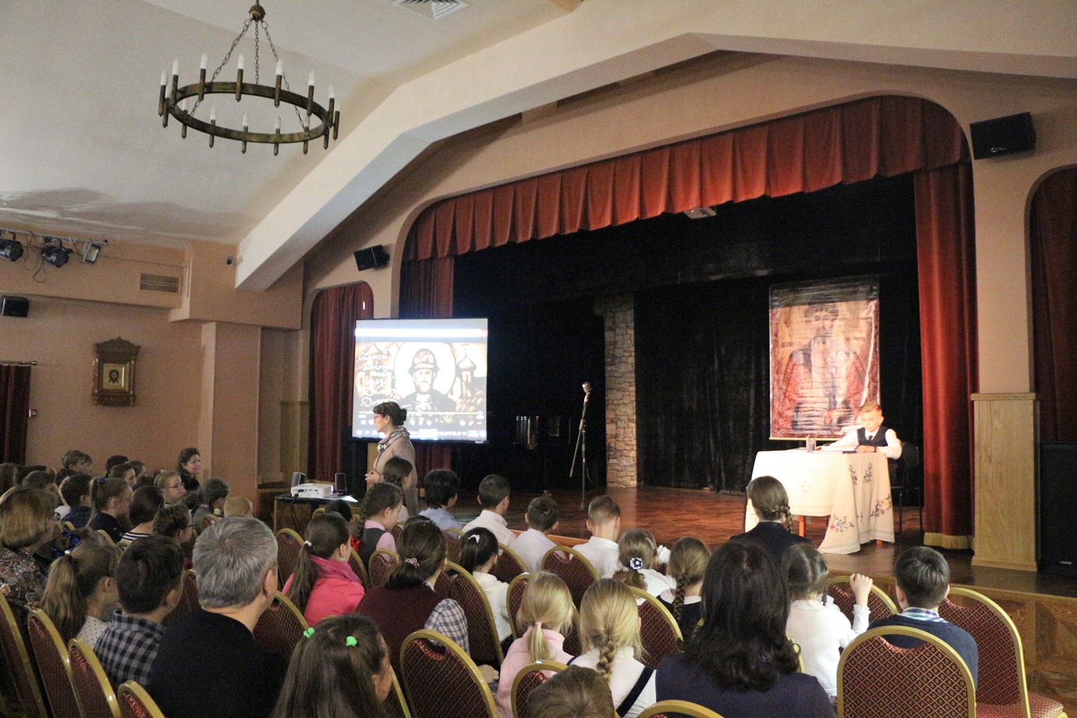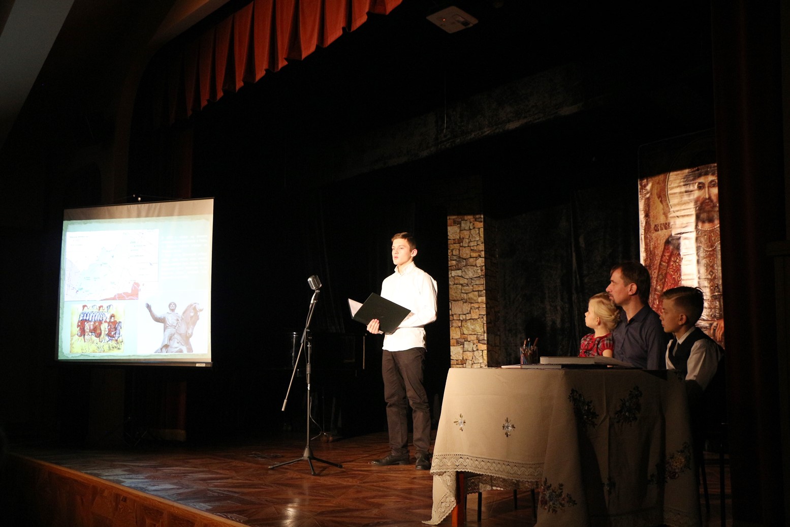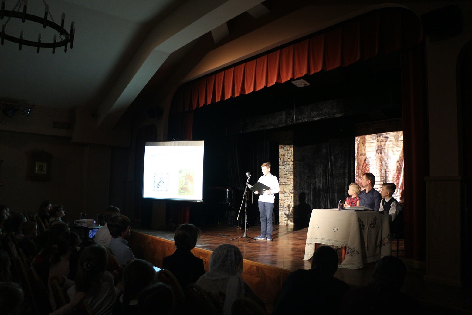 А в нынешнем году, в последнее воскресенье ноября, учащиеся, учителя и родители были приглашены на научную конференцию, посвящённую святому покровителю нашего храма, благоверному великому князю Димитрию Донскому, и его супруге, святой преподобной княгине Ефросинии. Причём, учитывая юный возраст большинства зрителей, организаторы этого события – учителя и учащиеся старших курсов школы – придумали для него необычный формат: научные доклады были «вставлены в раму» театрального действия. Его герои – подросток Иван, готовящийся к уроку истории, его любознательная младшая сестрёнка Ксюша и их отец – задавались вопросами об особенностях времени, в котором жили святые Димитрий и Ефросиния, размышляли об их служении и подвиге и получали ответы и из сообщений докладчиков, и из приготовленных ими красочных и информативных презентаций, и даже из поэтических произведений, которые были органично вплетены в ткань исторического повествования.