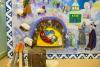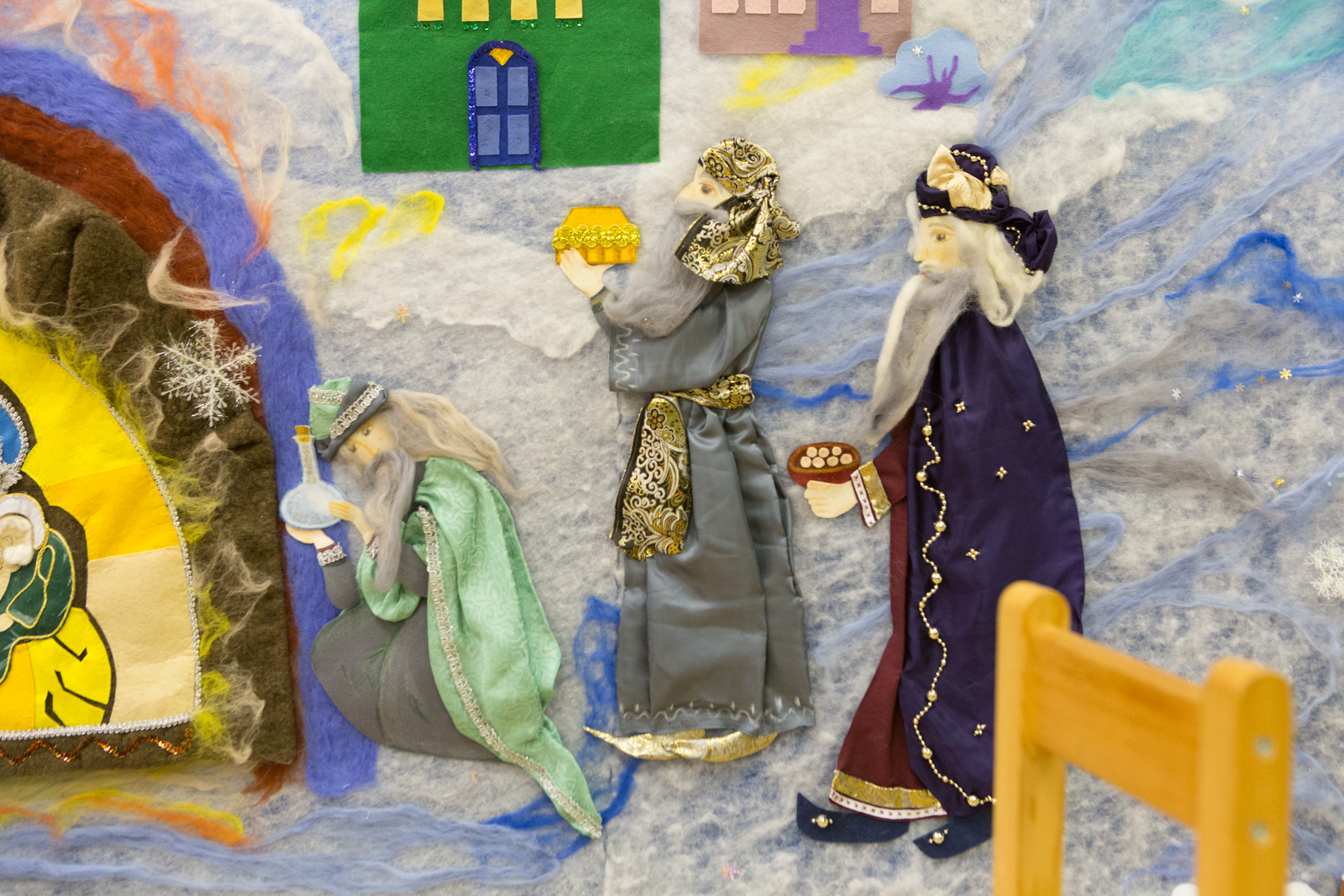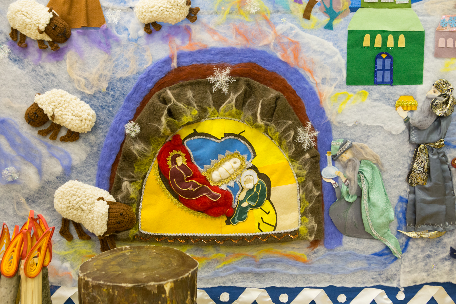 Особые слова стоит сказать о главной декорации праздника, представленной большим панно с изображением празднования Рождества Христова. Собранная из множества разноцветных лоскутов тканей, занимающая 3 метра в высоту и 4,5 в ширину, картина собрала вокруг себя не один десяток тружеников, которые мастерили её в течение всего Рождественского поста. Автором идеи стала преподавательница декоративного искусства и рукоделия в Воскресной школе Ирина Маркова: «Вот бегут дети; кто-то лепит снеговика, кто-то обратил свой взор к храму: “Смотрите, какое интересное облако, похоже на человека с крыльями!”. Начали мы где-то в октябре, и постоянно появлялись всё новые и новые помощники. Я благодарю всех участников творения этой картины».