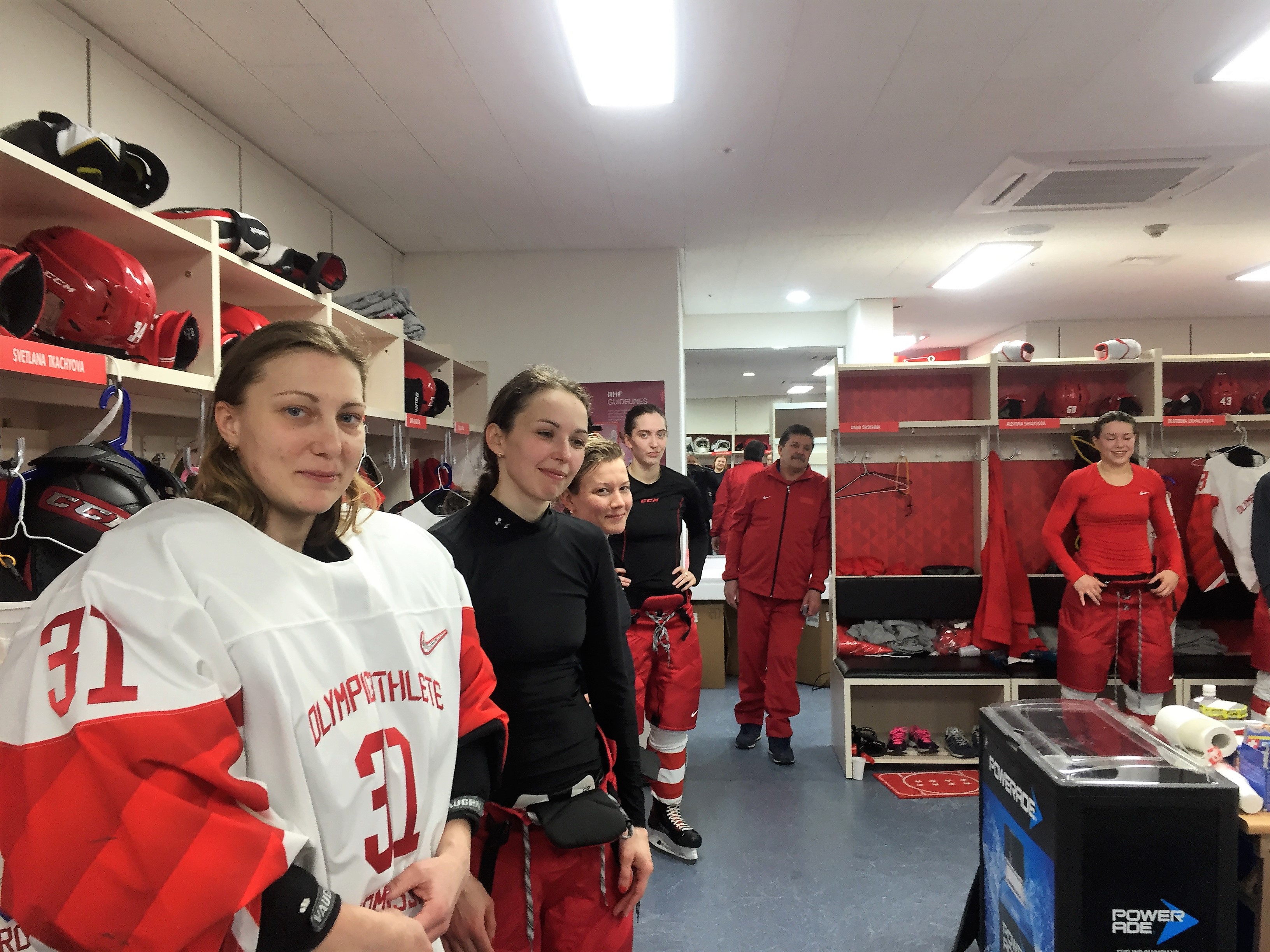 Мы двинулись к другому КПП, возле которого я, проезжая мимо, всегда видел стоящие автобусы. Оказывается, именно оттуда разъезжаются на соревнования олимпийские команды. И вот тут меня задержали, так как выяснилось, что я не могу сесть в автобус со спортсменами. Точнее, мог бы, если бы имел на это особое разрешение: в таком случае на бейдже должен стоять специальный значок. Но у меня его не было, а значит, я не мог ехать вместе с командой. Срочно набрав телефон своего сопровождающего, я, к своей большой радости, обнаружил, что он по стечению обстоятельств находится недалеко: пьёт кофе и завтракает в соседнем с деревней ресторанчике. В общем, нам пришлось разделиться: девушки поехали на автобусе, а я на машине. Мы договорились встретиться в ледовом дворце, и вот я уже спускаюсь вниз, в то место, где находится раздевалка – помещение, состоящее из нескольких комнат и длинного коридора. Здесь – вся необходимая амуниция: и клюшки, и различная форма – прямо доспехи.