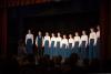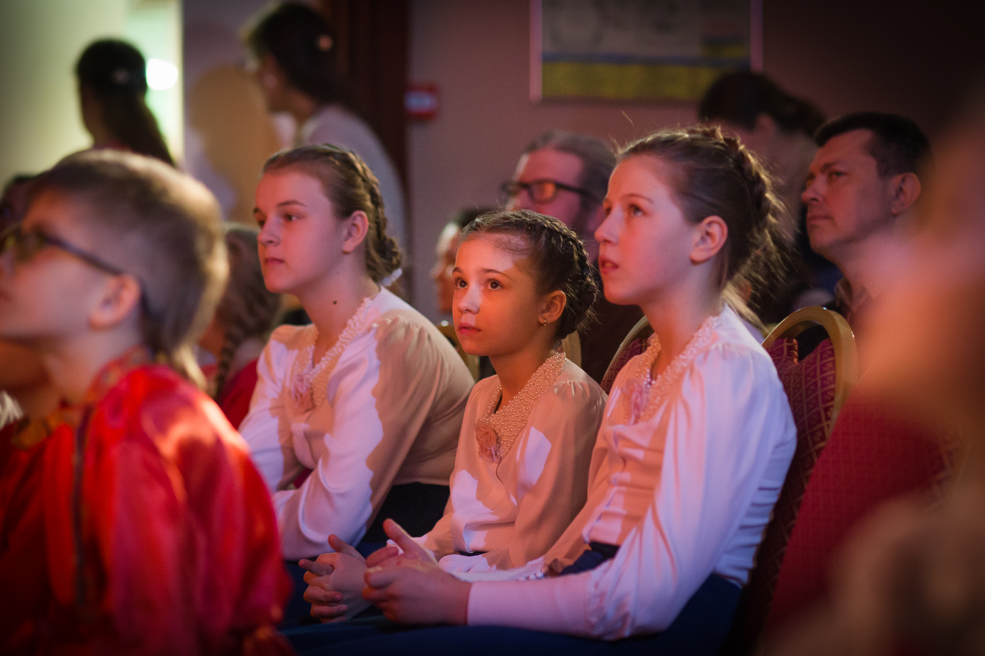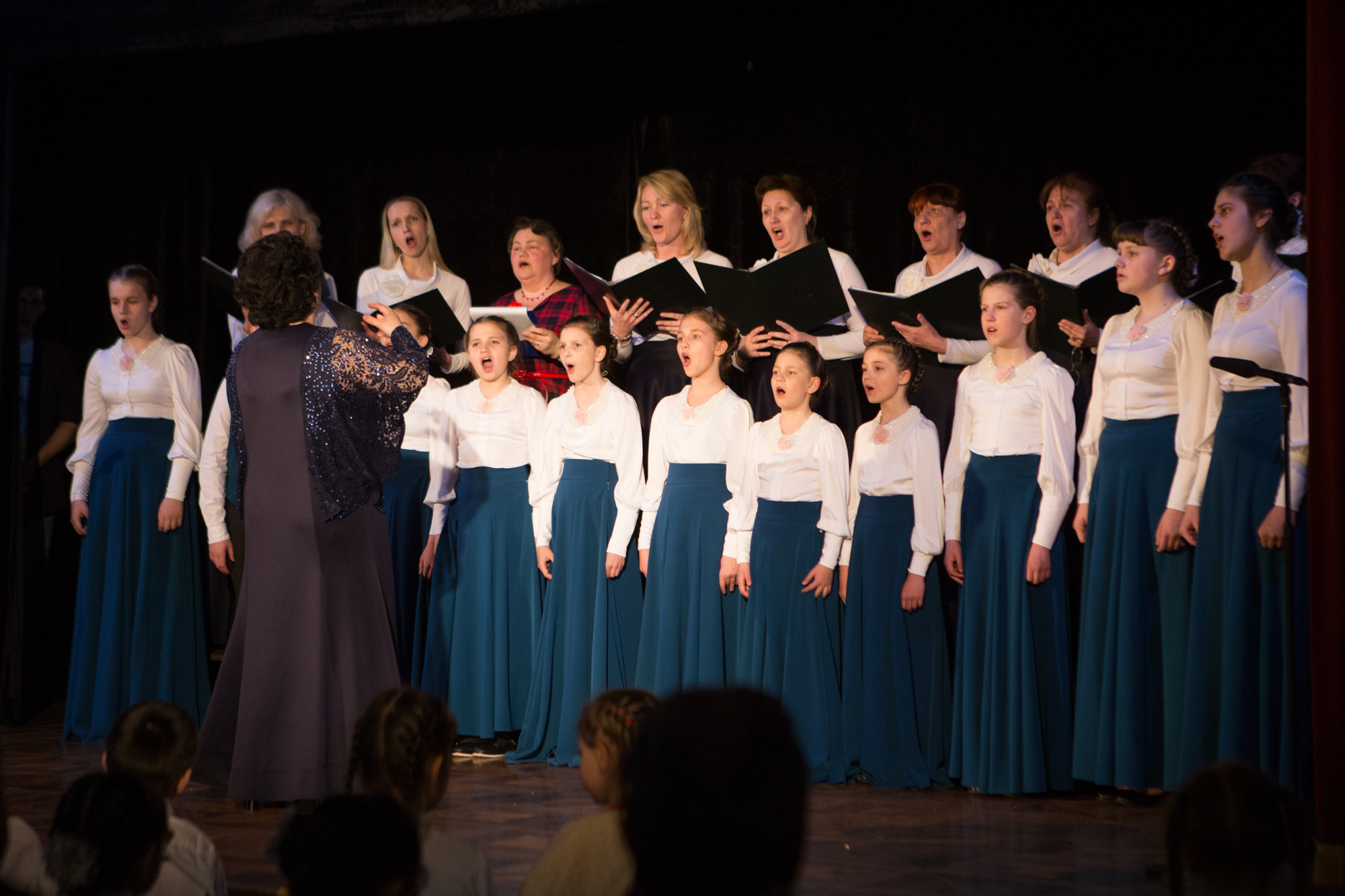 Вскоре поздравить гостей вышли и наши первоклассники, учащиеся гимназии «Восход», представившие на сцене музыкально-поэтическое путешествие по весеннему родному краю... Далее на сцену пригласили старший хор – это те юные певчие, которые принимают участие в концертных номерах вместе со взрослыми, то есть уже входят в состав концертного хора ансамбля «Восход». Сидящие в зале услышали замечательную кантату «Три чуда», написанную Александром Жировым по фрагментам любимой многими поколениями русских читателей пушкинской «Сказки о царе Салтане».