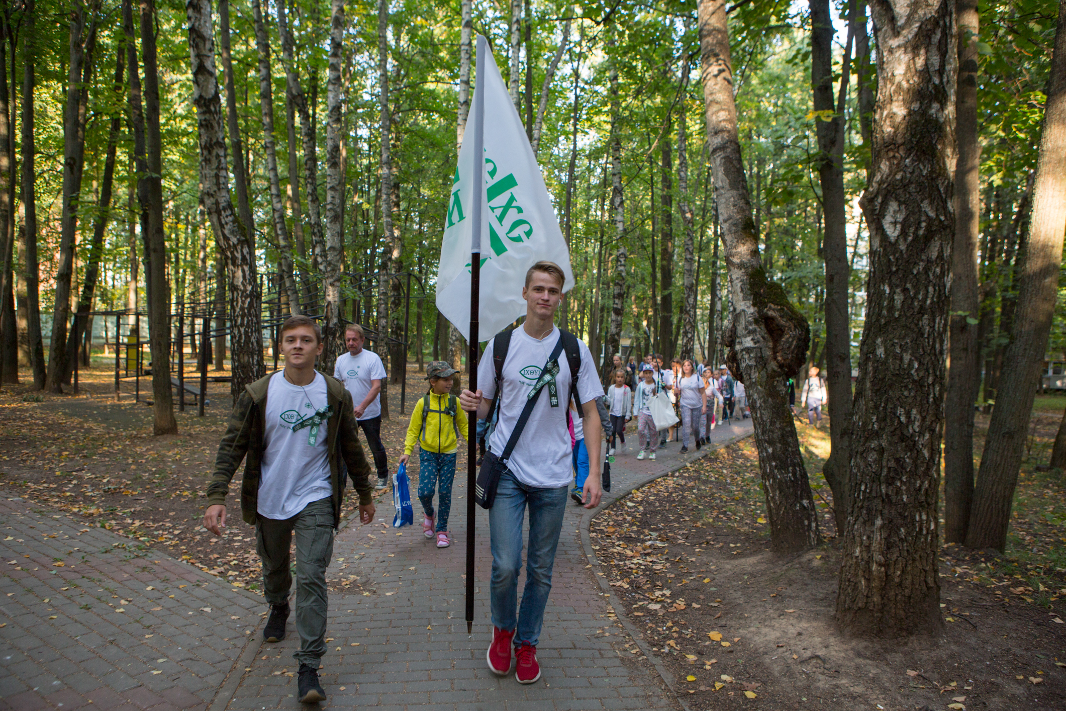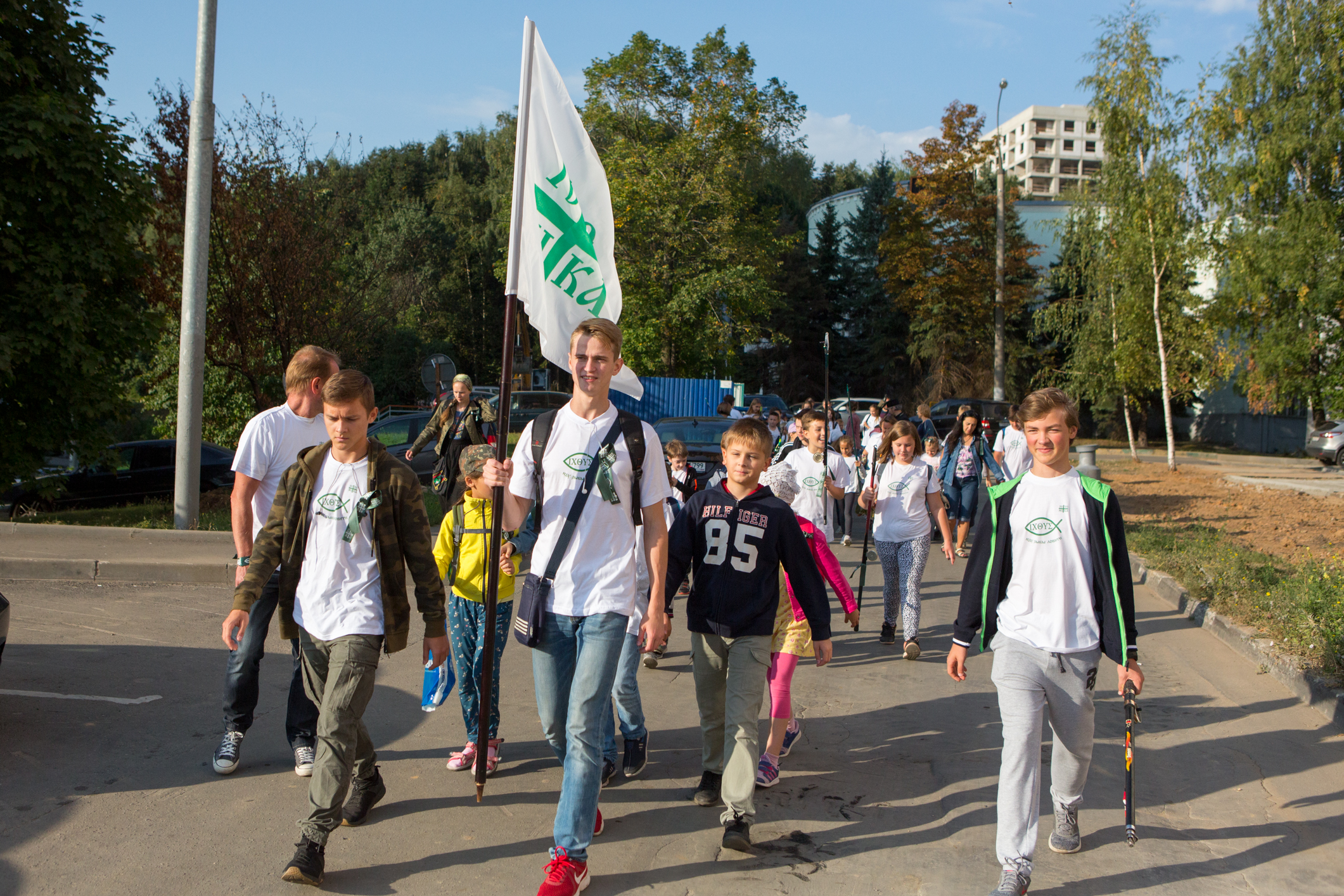Уже который год Большая рыбалка собирает в последние дни каникул множество детей и подростков – учащихся и выпускников действующего при храме культурно-просветительского центра «Восход». Ранним утром ребята стекаются в храм на молебен, а затем дружным шествием отправляются через весь район к Ботаническому саду ВИЛАР. Перед выходом с Подворья и ребята, и взрослые облачаются в одинаковые белые футболки с символикой Большой рыбалки: логотипом IXΘYΣ и словами «Иду рыбы ловити».