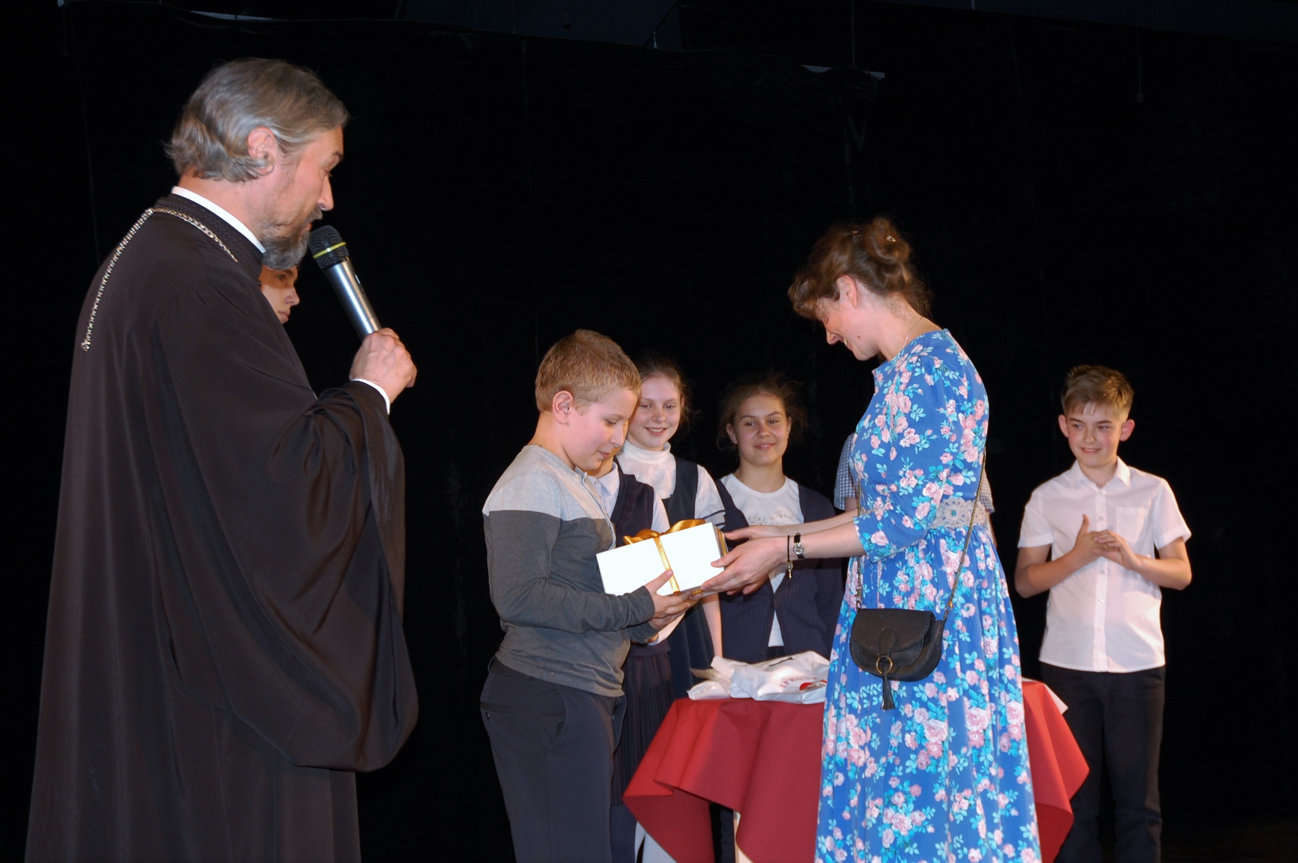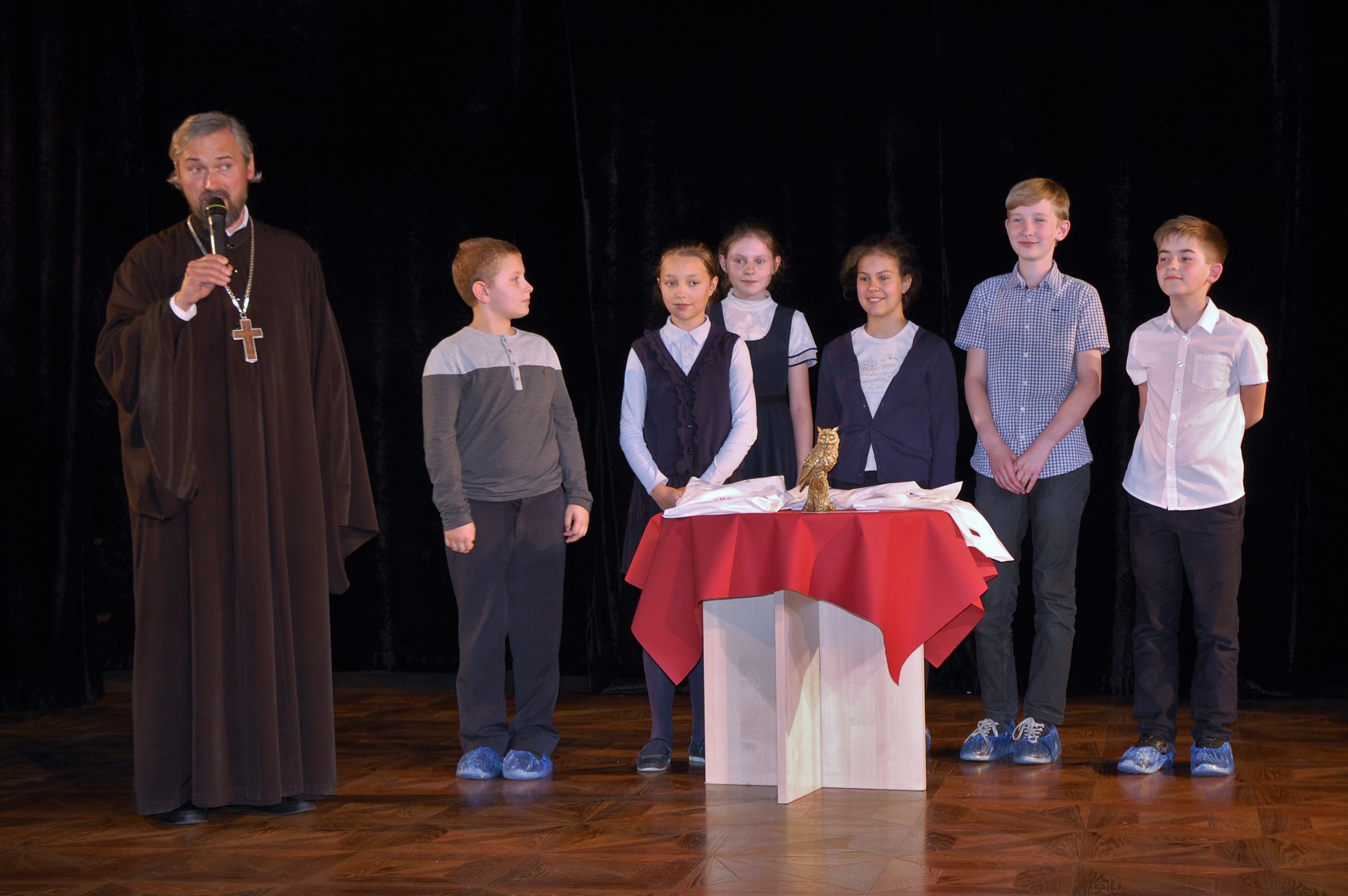 Ну а победу в этот раз одержала команда школы 2006 «Спасатели», девиз которой звучал так: «Спасся сам – спасай другого». Так радостно было вручать сладкий приз – торт с фигуркой совы – и другие подарки этой дружной команде! Но и остальные участники не ушли без подарков: всем ребятам достались сладости и открытки со стихотворным пожеланием от председателя жюри протоиерея Андрея Алексеева, обращенным к ним как к выпускникам младшей школьной ступени: