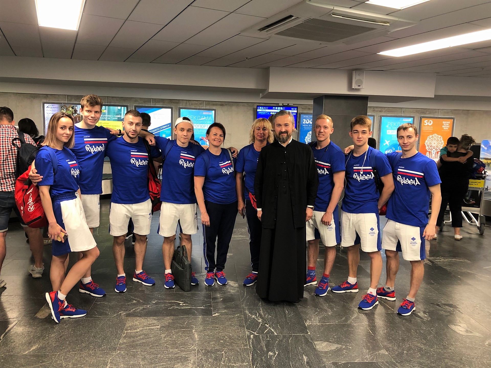 При получении багажа я познакомился со спортсменами и тренерами нашей сборной по спортивной аэробике, и мы, конечно, поговорили и об их перспективах на грядущих играх, и о том, что постараемся встретиться в часовне в Олимпийской деревне, чтобы пообщаться и вместе позвать Господа перед важными испытаниями. А пока мы сфотографировались на память.
