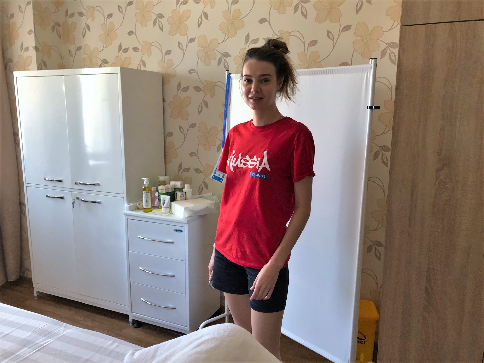 После общения с Москвой я наконец поднялся на шестой этаж, где располагается наш медицинский центр. Там я совершил традиционный молебен, покропил святой водой оборудование и комнаты, где находится всё необходимое для поддержания здоровья спортсменов, и, конечно, был рад вновь увидеть главного врача сборной России, Андрея Жолинского. Я стал записывать имена всех тех, кто сегодня трудится в медцентре. Итак, три Андрея, Евгений и… когда я зашёл в последнюю комнату, то увидел там доктора Катю. С ней мы познакомились в 2017 году в Дьёре, где я был с нашей молодёжной сборной на XIV Европейском юношеском Олимпийском фестивале. В тамошней деревне часовня находилась в одной из комнат медцентра, и доктор Катя, как я тогда её для себя назвал, помогала мне развешивать иконы.