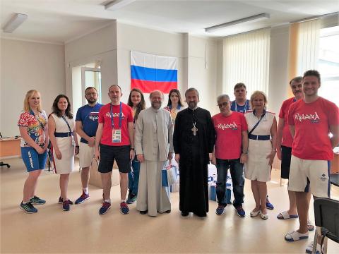 После молебна футболисты ушли, а мы с отцом Феодором заглянули в штаб нашей сборной, где все вместе сфотографировались. Батюшка получил подарки от нашего руководства и в свою очередь передал для спортсменов маленькие плитки шоколада, при этом с улыбкой добавив: «Надеюсь, это не станет для них нарушением режима». После этого я проводил отца Феодора до КПП, а он по пути рассказал мне и девушкам-волонтёрам забавный анекдот: