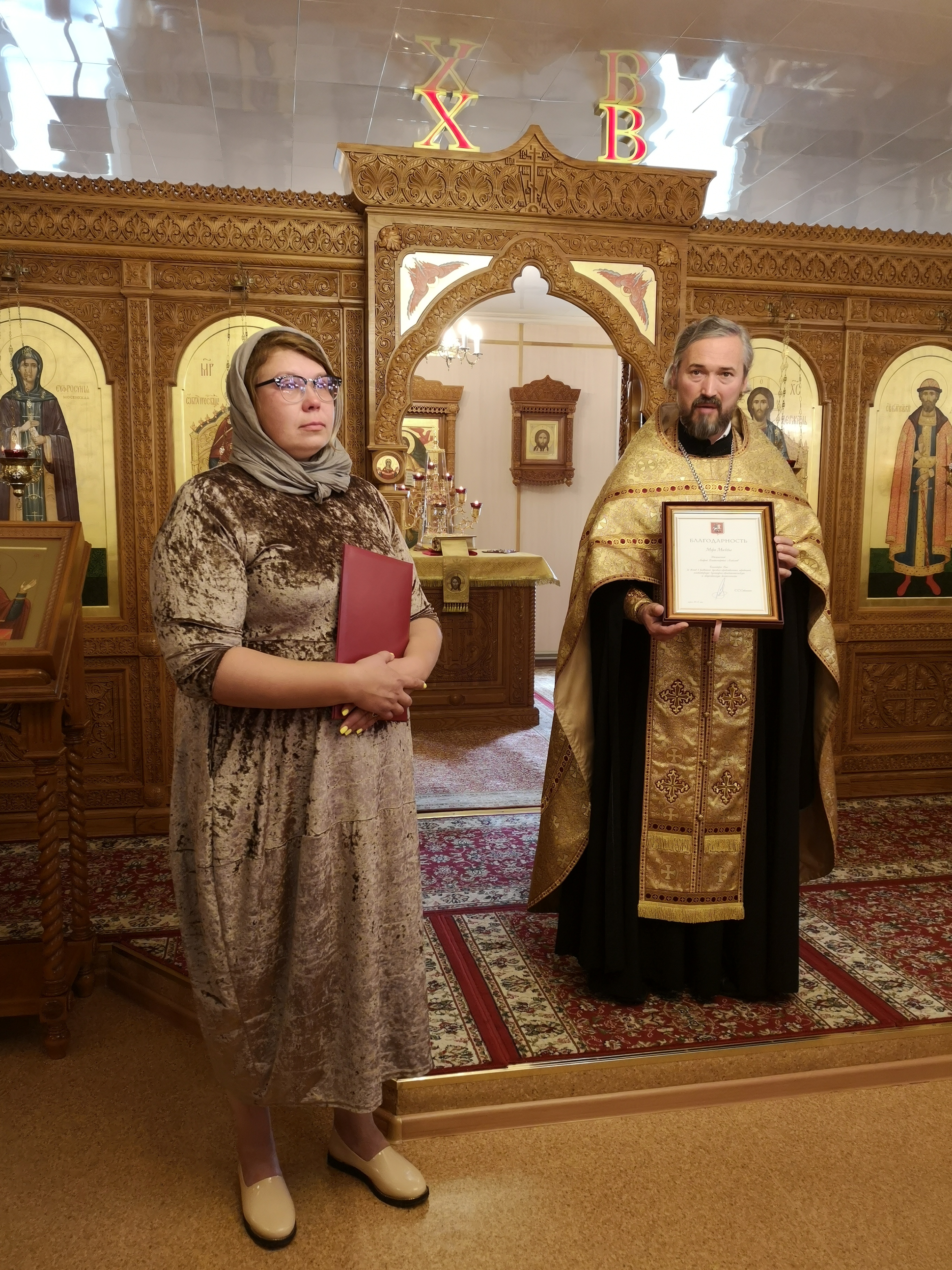 Также настоятель со своей стороны наградил Регину Михайловну и Главу Муниципального округа Северное Бутово Алексея Александровича Курбатова грамотами «за труды, помощь и поддержку деятельности общины храма святого благоверного великого князя Димитрия Донского в Северном Бутове города Москвы».