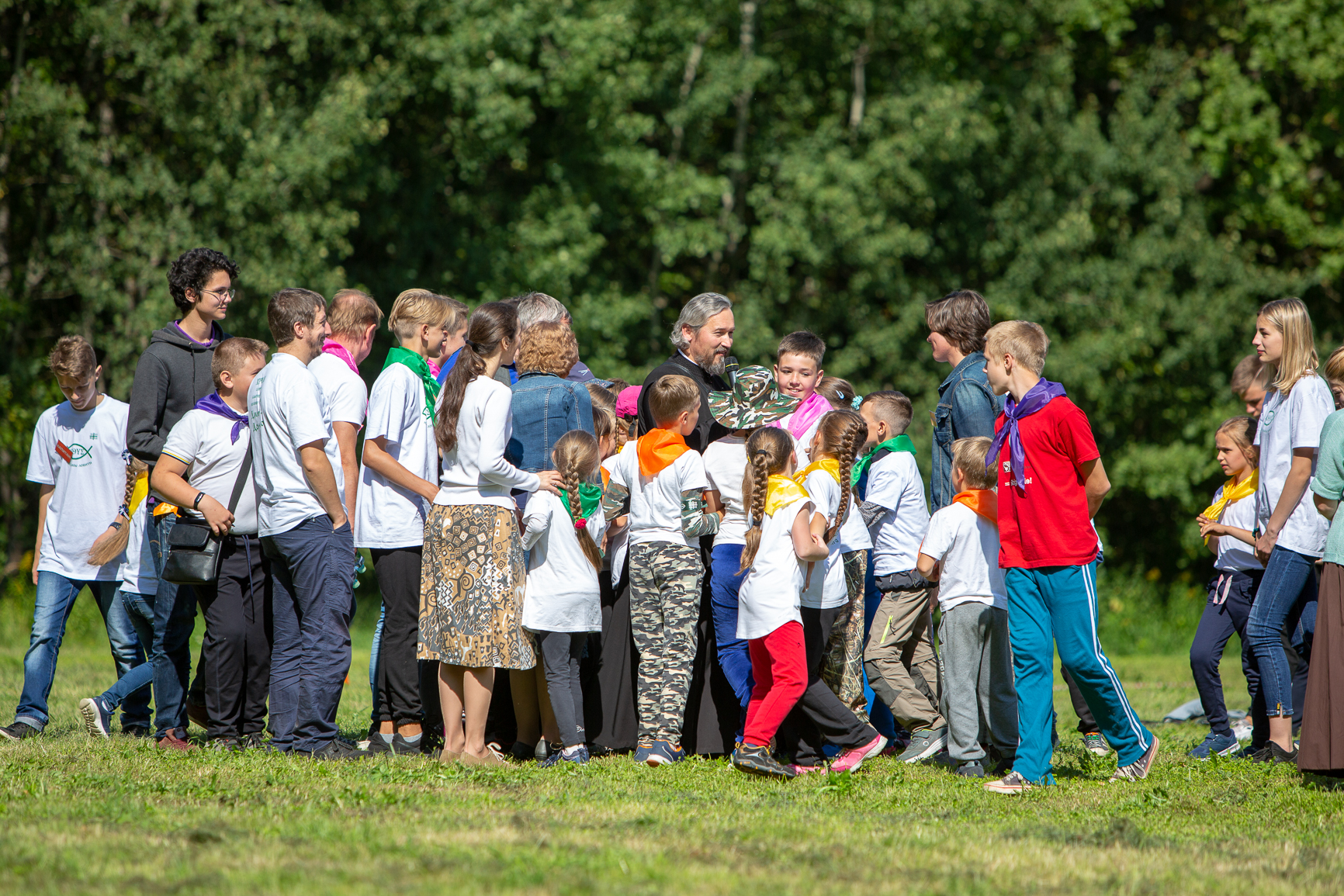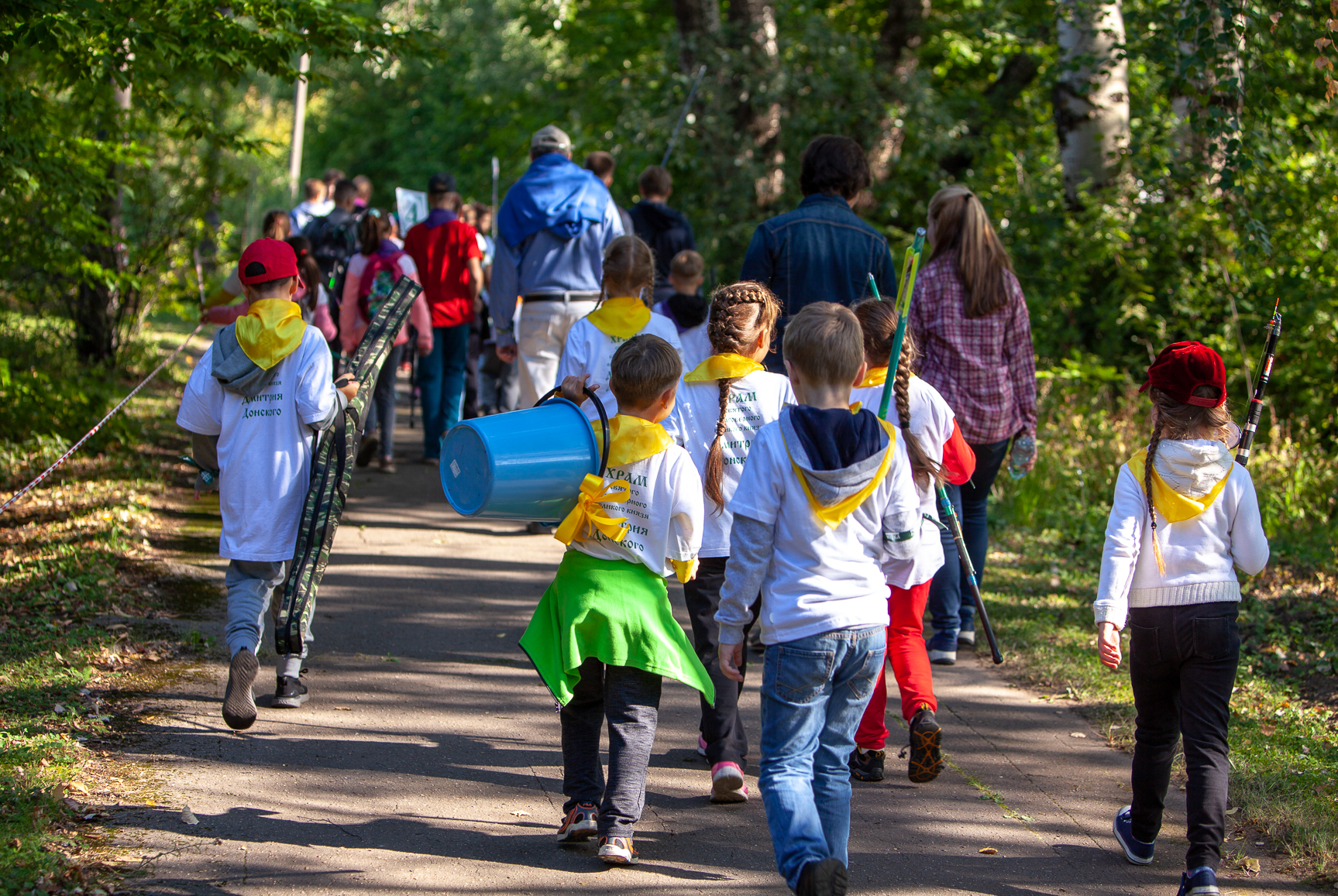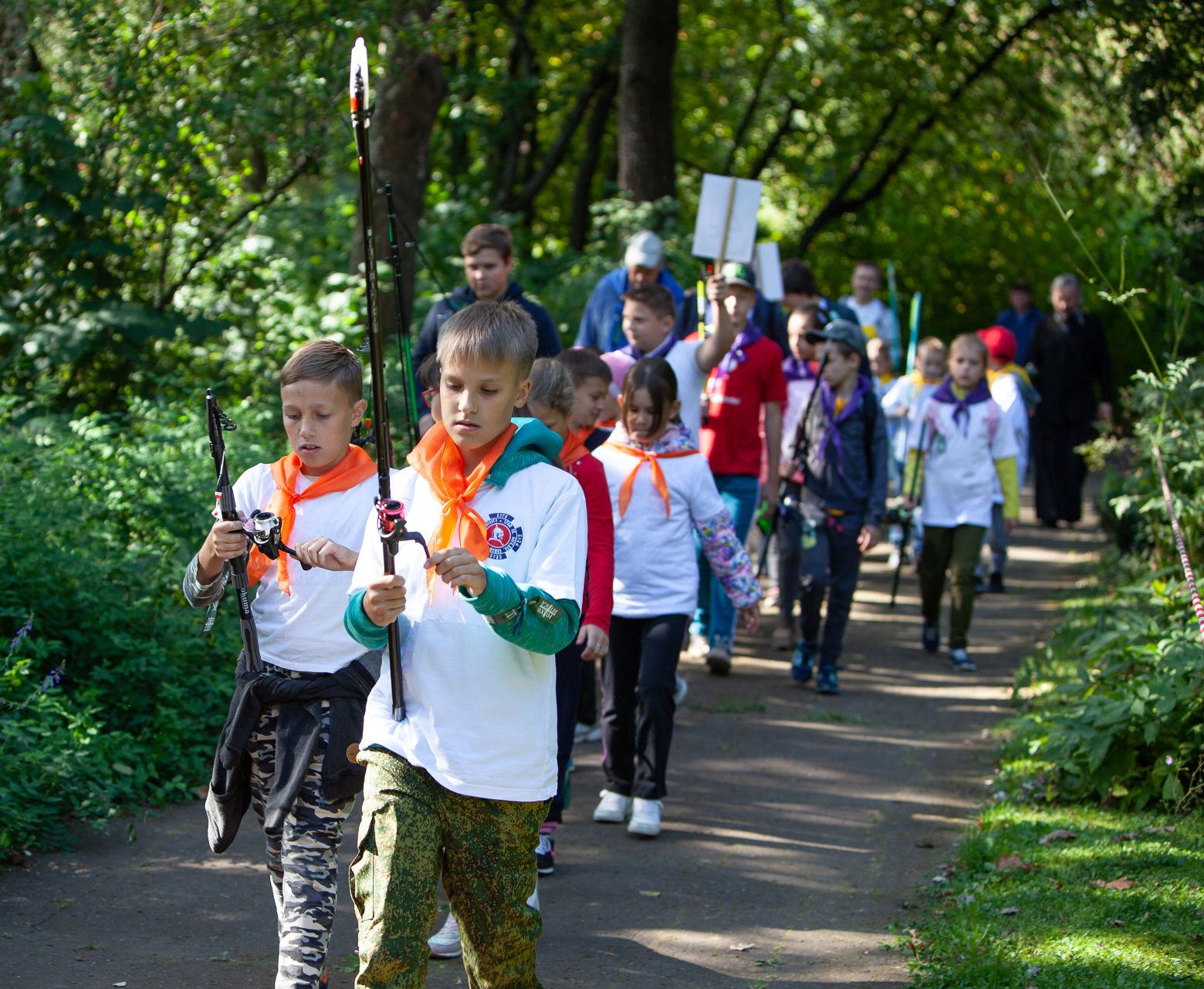 На этот раз участие в рыбалке приняли наши школьники – учащиеся Православной гимназии «Восход». Начался день с торжественного шествия юных рыбаков от территории Подворья до ВИЛАРа – через весь район, с большим белым знаменем и с удочками в руках. На месте ребят распределили по командам. У каждой было своё доброе название: «Мир», «Радость», «Вдохновение», «Стремление», «Надежда» – и свой цвет галстуков, яркий и радостный.