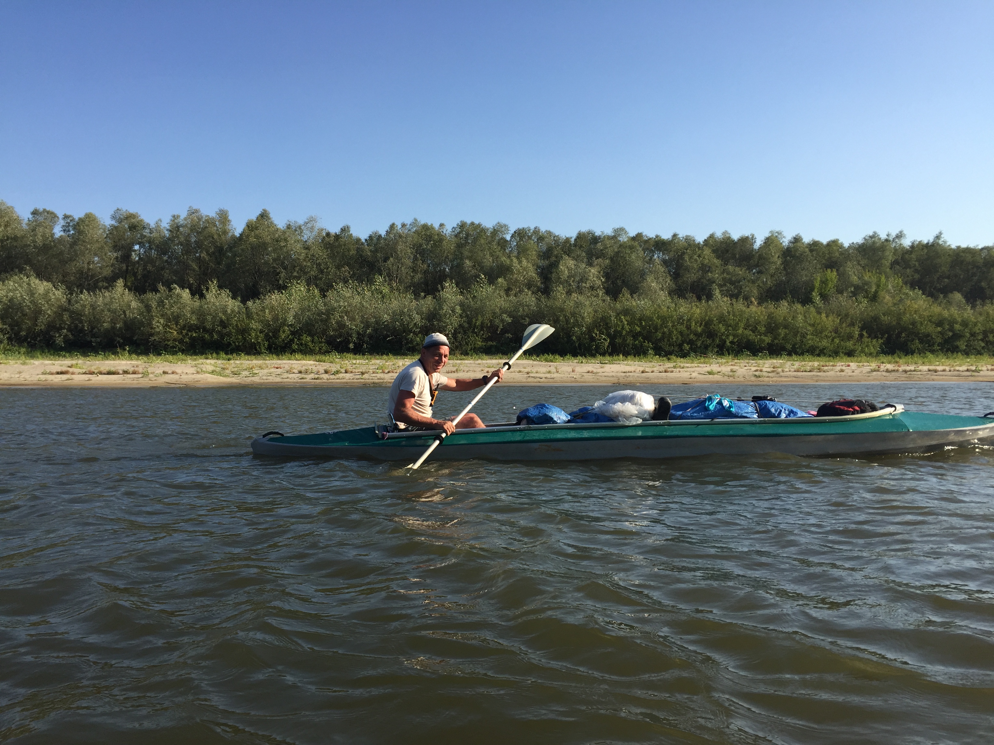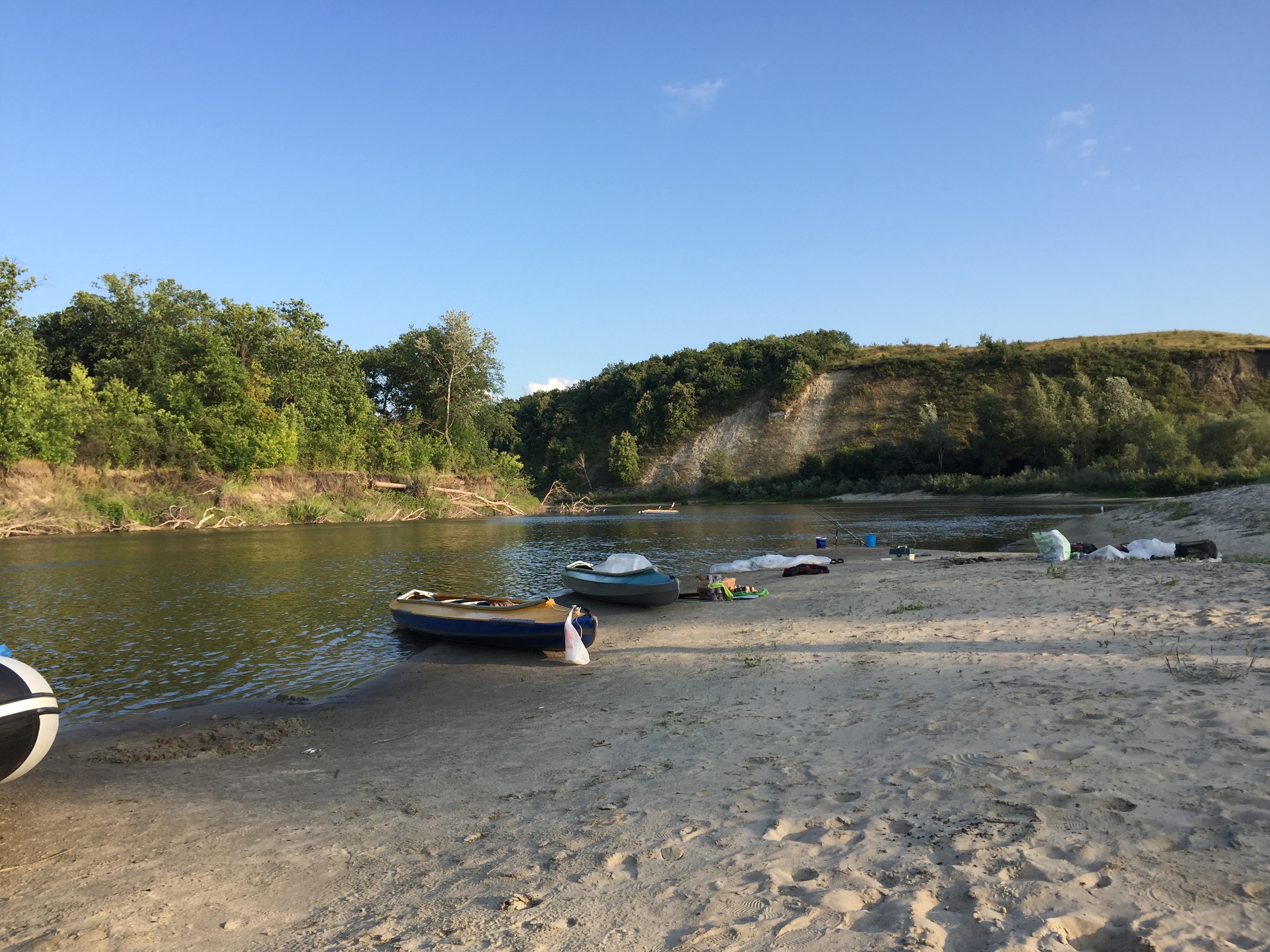«После устроенного вместе со всеми небольшого пикника на берегу Хопра мы продолжили свой путь уже от станицы Слащёвская и до ближайшего подходящего для стоянки пляжа. Дождь стал понемногу усиливаться. Мы с Вовой поплыли теперь первыми, но, пройдя километр, посреди реки налетели на мель. Судя по звуку мы сначала подумали, что под нами камни, но когда снимались с места, поняли, что это ракушки. Хопёр в том месте ещё на протяжении километра был очень мелким, и пройти по нему на байдарке можно было только ближе к левому берегу. На дне находилось огромное количество ракушек, оставлявших на песке за собой причудливые следы. Скоро я заметил на дне байдарки воду и сначала решил, что она скопилась от непрекращающегося дождя, однако она довольно быстро прибывала, и мы едва успевали её откачивать. За это время остальные нас обогнали и скрылись за поворотом. Поняв, что далеко мы не проплывем и нам нужна помощь, я стал вызывать по рации подмогу, но на запросы уже никто не отвечал. Дождь становился сильнее и сильнее. Необходимо было срочно искать место для аварийной стоянки. По карте я увидел невдалеке пригодный пляж, и мы спешно поплыли к нему на быстро тонущей байдарке, Вова при этом запел песню «Варяг».