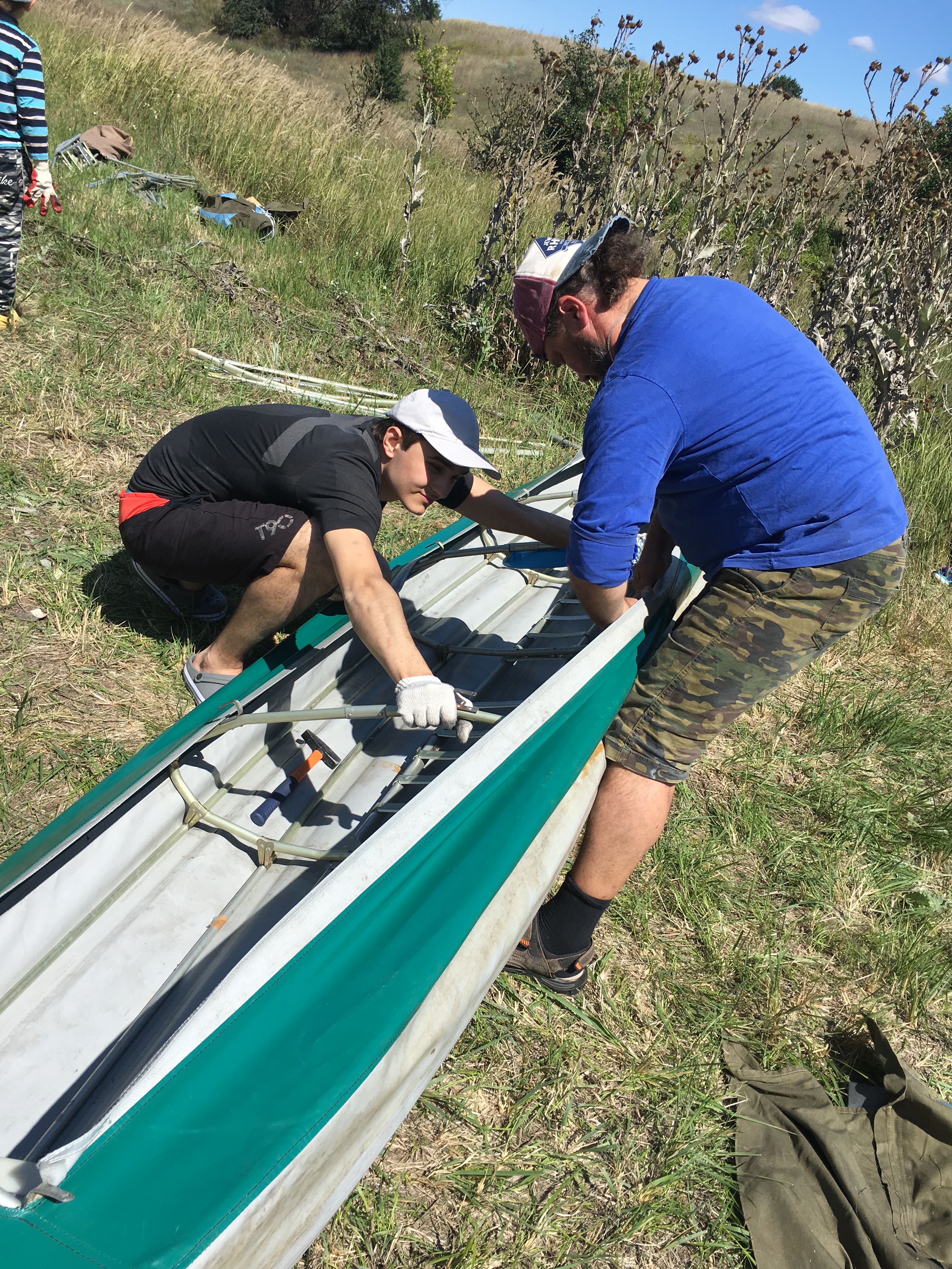Затем принялись собирать байдарки. Процесс не из лёгких, главное – не ошибиться в последовательности металлических трубок (стрингеров) и осей отверстия (шпангоут), иначе приходилось разбирать и собирать всё снова. В этом интересном мероприятии участвовали и дети.