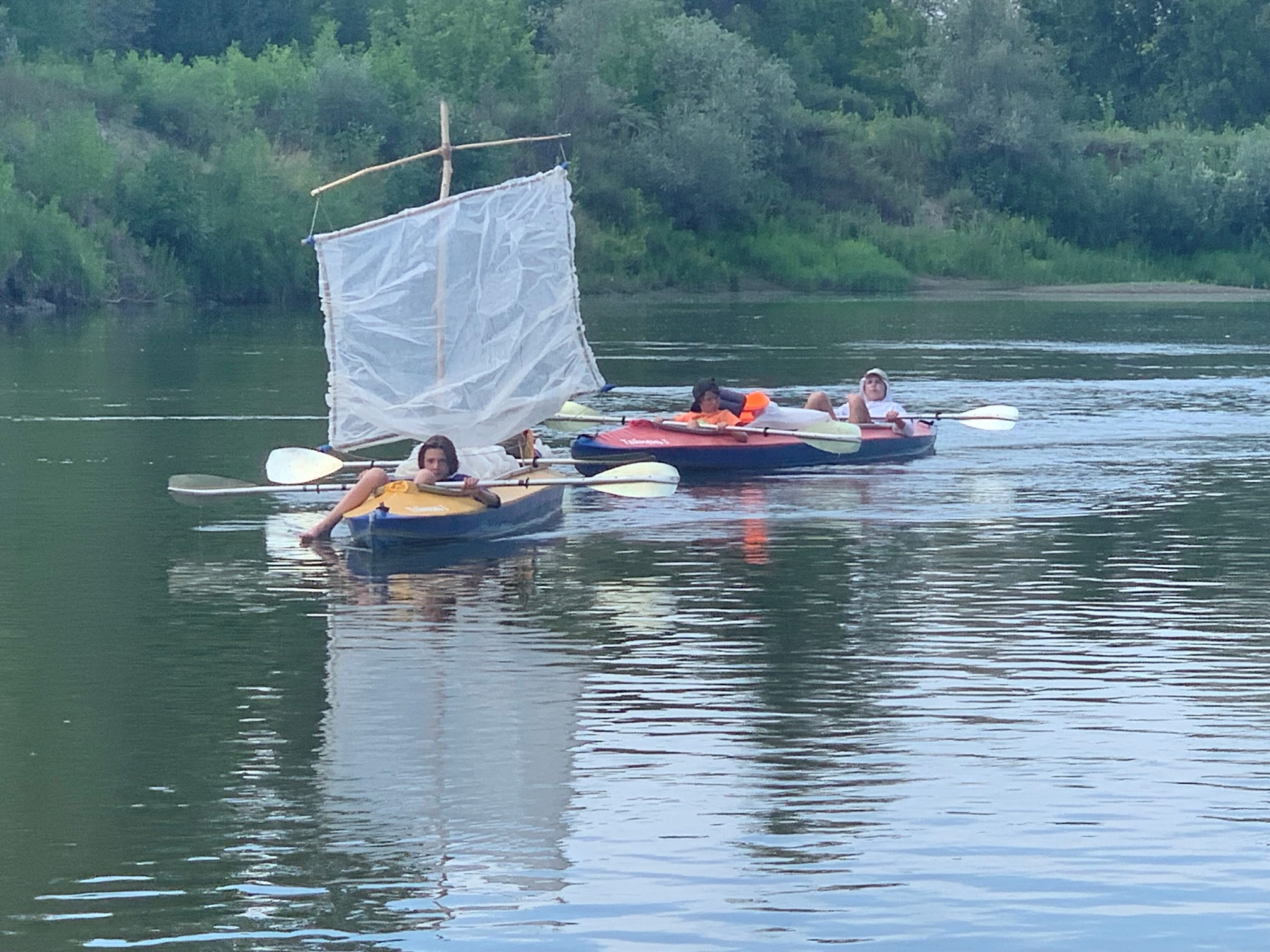 Материалов про наш поход можно насобирать на целую книгу, поэтому я, наверное, расскажу то, что запомнилось больше всего мне. Для меня одной из приоритетных задач в этом походе было построить парусное вооружение на байдарку. Эта задумка осложнялась тем, что на модель байдарки «Таймень 3» не предусмотрена установка руля. Но парус мы всё равно сделали. Он состоял из основной мачты 2,5 метра в высоту, двух рей и собственно самого паруса и двух шкотов, с помощью которых парус натягивался и закреплялся наверху мачты. Из-за гибкости конструкции им можно было легко ловить ветер. Такой парус развивал скорость до 10 км/ч, что в два раза больше нашей обычной скорости. Проблемы и недостатки тоже были: главным образом они заключались в отсутствии попутного ветра – ветер почти всегда был встречный (против такого ветра и на вёслах идти было сложно, не говоря уже о парусе), хотя иногда он всё же менялся и дул нам в спину. Но всё равно парус ещё нуждается в усовершенствовании.