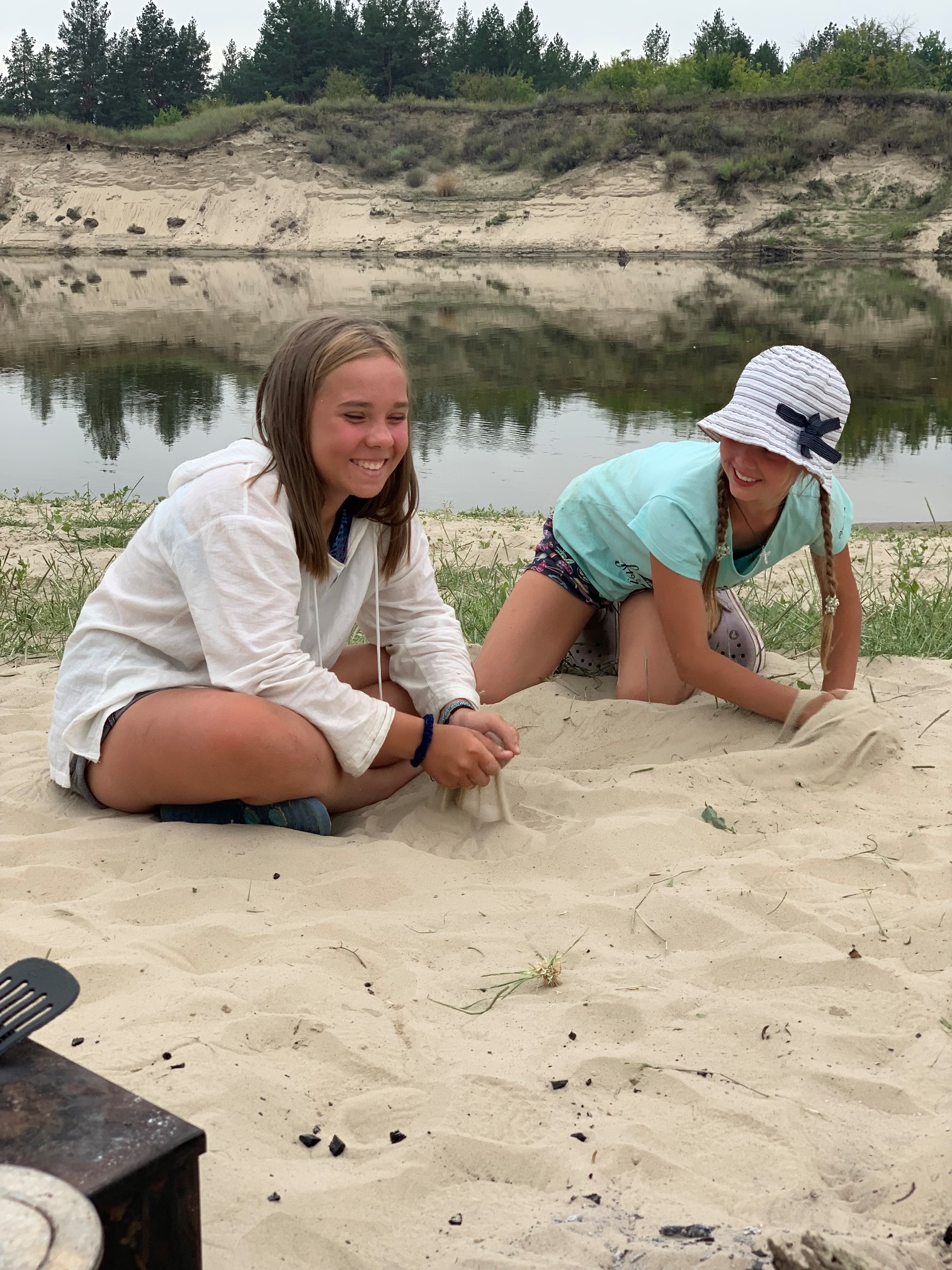 На следующий день я проснулась очень рано, ещё не рассвело. Я решила выбраться из палатки, на улице было пасмурно и зябко. Я отправилась к реке и вдруг увидела, что у нас уплыла плёнка, которой мы укрывали байдарки от дождя. Через пару минут пришел отец Анатолий. Я показала ему скрывающуюся за поворотом реки плёнку, а он только вздохнул и отправился осматривать удочки. Вскоре он позвал меня и попросил взять подсачник и помочь ему вытащить рыбу. Это оказался сом! А через час нас накрыла гроза. Был сильный ветер, и он всё перевернул вверх ногами. Но мы быстро всё собрали, и отец Анатолий стал готовить сома. Он оказался очень вкусным! А в конце похода Господь послал нам ещё и двухкилограммовую щуку.