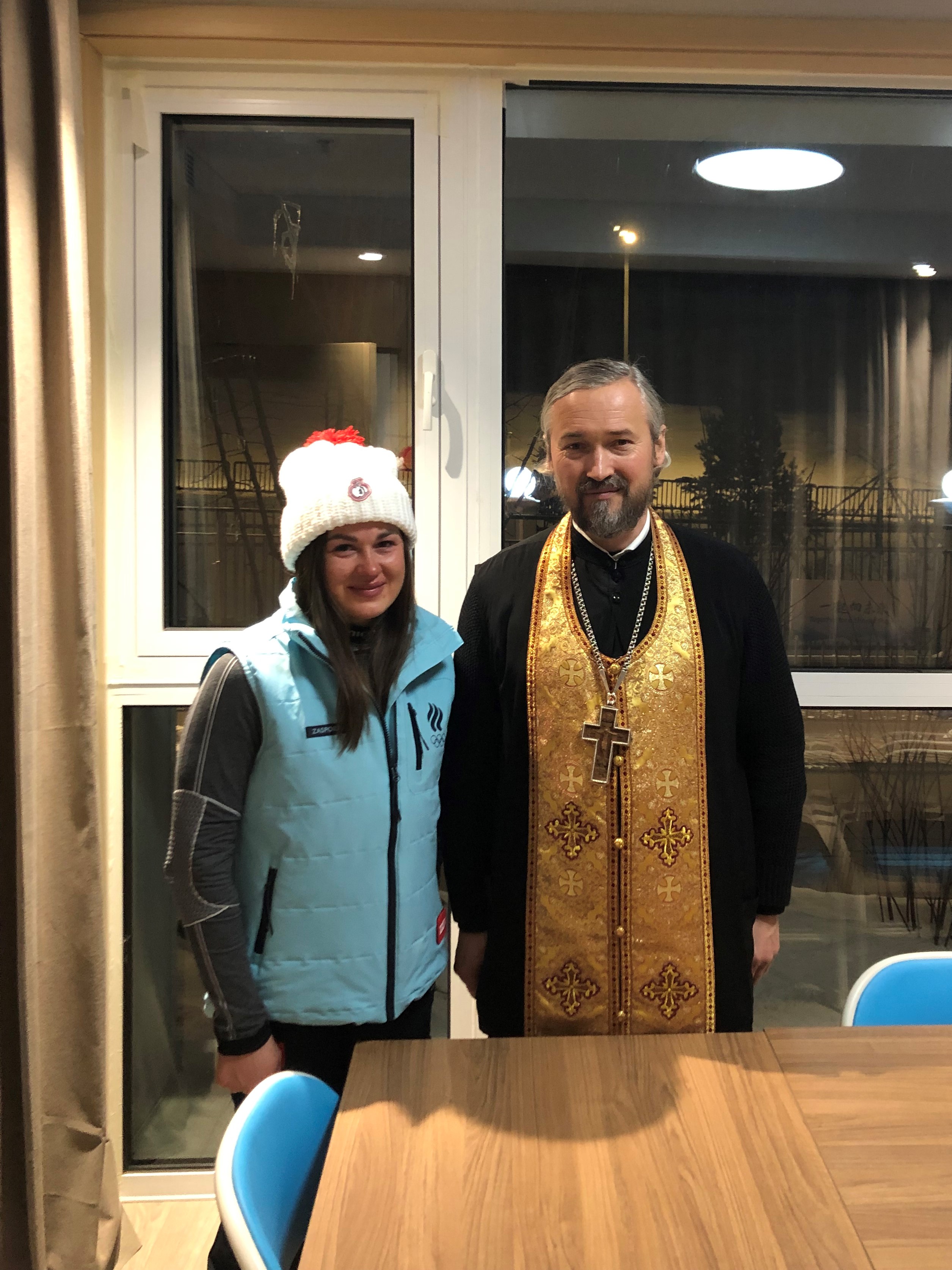 Добравшись до дальней олимпийской деревни под названием Чжанцзякоу, мы погрузились в особый мир, так отличающийся от того, что стало нам уже привычным в Пекине. И сама деревня уютнее и краше, и в столовой кормят вкуснее, и ограничения здесь не такие строгие, а на улице – да, холодно, ощутимо холодно: утром было минус двадцать пять. Зато работники нашего штаба компенсируют всё горячим русским гостеприимством, а о радушии Александра Орлова можно писать песни, и я не преувеличиваю. А вот и цель нашей поездки: нас встречают Юрий Анатольевич Чарковский – экс-тренер, а ныне менеджер российской сборной по лыжным гонкам, и его подопечные – Александр Большунов и Татьяна Сорина, уже завоевавшие на этих Играх свои медали: Саша две золотых и одну серебряную, и Таня одну золотую. Ребята хотели видеть священника, и священник к ним приехал! Мы служим молебен, а затем общаемся, и в ходе беседы Юрий Анатольевич говорит об очень глубоких и близких мне вещах. Как же отрадно было мне как пастырю Церкви слышать рассуждения этого маститого наставника, преподающего молодому поколению замечательные уроки любви к Родине и отношения к делу!