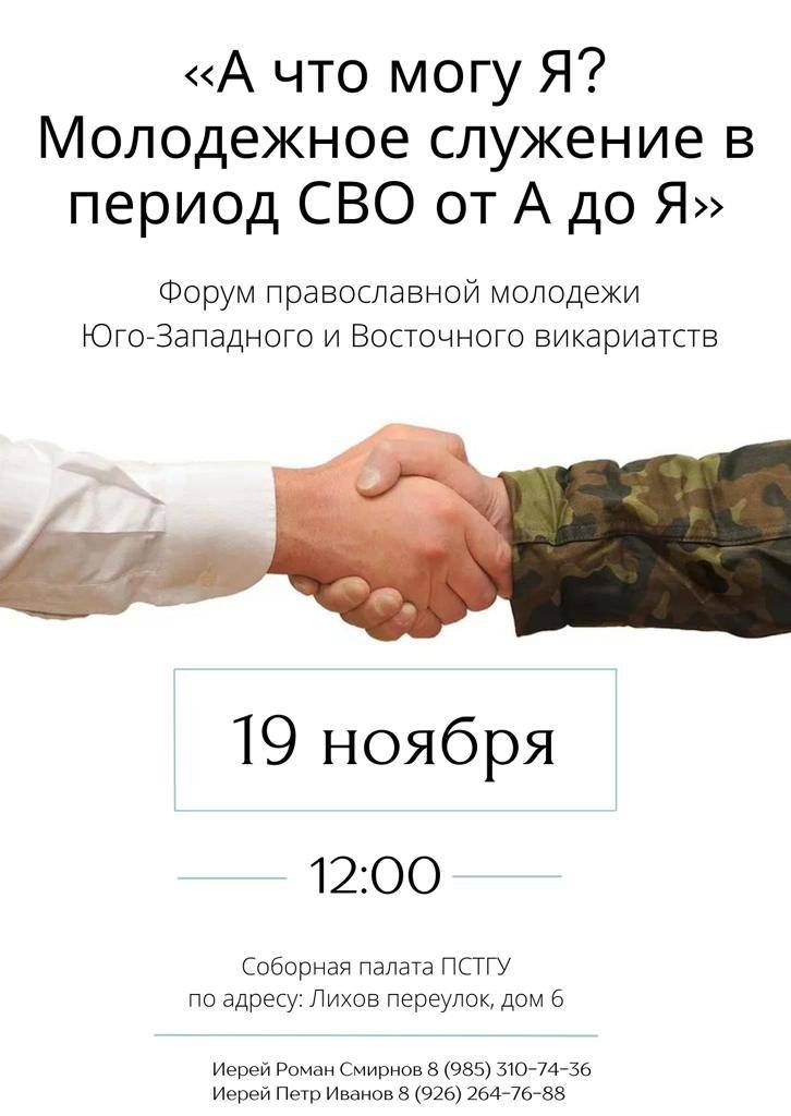 19 ноября 2022 года в Соборной палате ПСТГУ по адресу: Москва, Лихов переулок, дом 6 пройдёт второй, заключительный этап Форума православной молодёжи Юго-Западного и Восточного викариатств на тему «А что могу я? Молодёжное служение в период Специальной военной операции от А до Я».