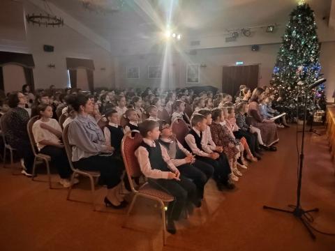 Гимназисты-пятиклассники рассказали ребятам об истории праздника Рождества Христова, о смысле прихода в мир Спасителя, а также об интересных Рождественских традициях. Затем младшие ученики гимназии показали гостям замечательное вертепное представление и исполнили песни Христославов, или колядки, которыми традиционно поздравляли друг друга на Святках верующие во многих христианских странах.