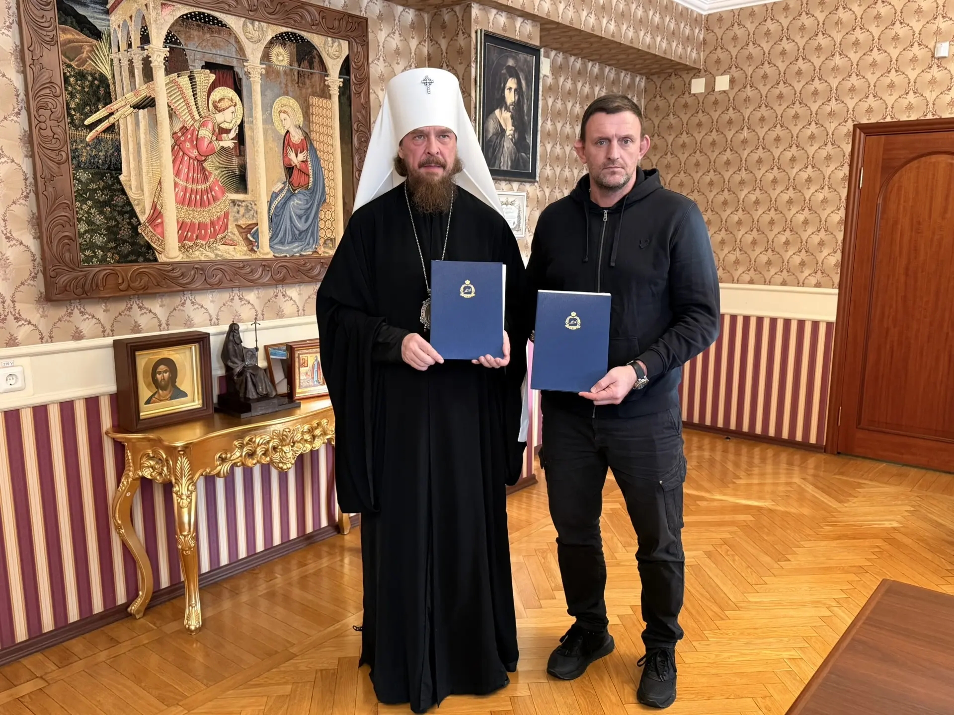 Заместитель председателя Патриаршей комиссии также принял участие в торжественной церемонии подписания соглашений о сотрудничестве между Челябинской митрополией и Федерацией бокса Челябинской области, региональной Федерацией смешанного боевого единоборства и спортивной школой № 10 по спортивной борьбе и самбо.