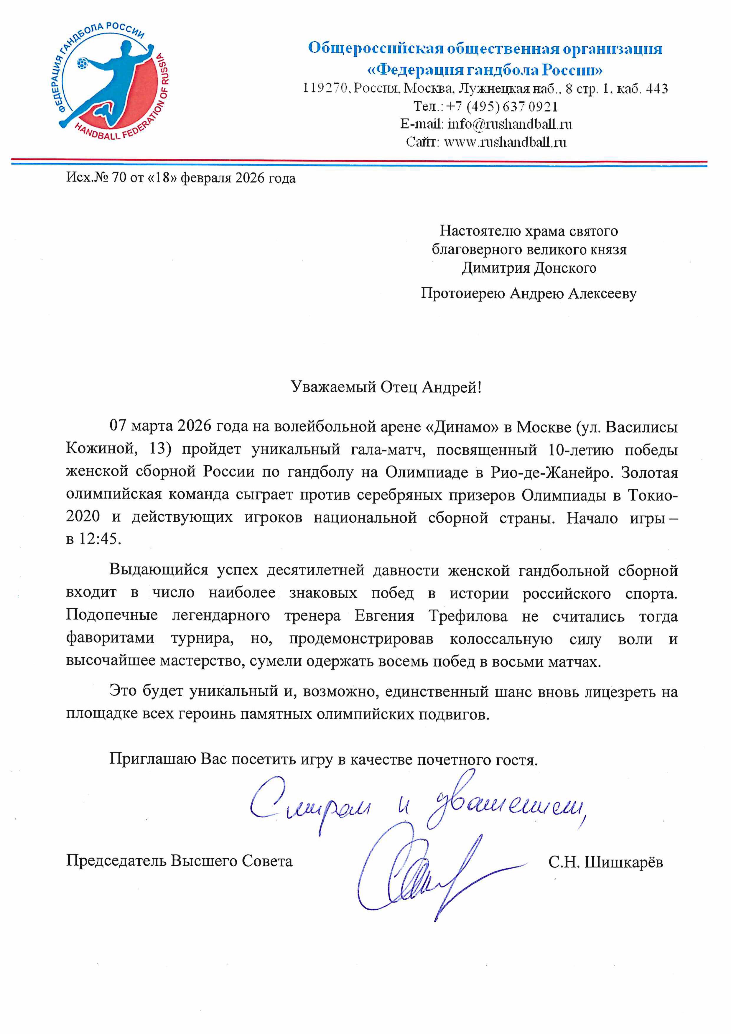 И вот на днях я получил от Федерации гандбола России приглашение на мероприятие, посвящённое десятилетию той яркой победы. В субботу 7 марта на спортивной арене «Динамо» в Москве пройдёт гала-матч, в ходе которого «золотая» сборная в составе 2016 года сыграет против действующих игроков национальной сборной страны, серебряных призёров Олимпиады в Токио 2020 года.
