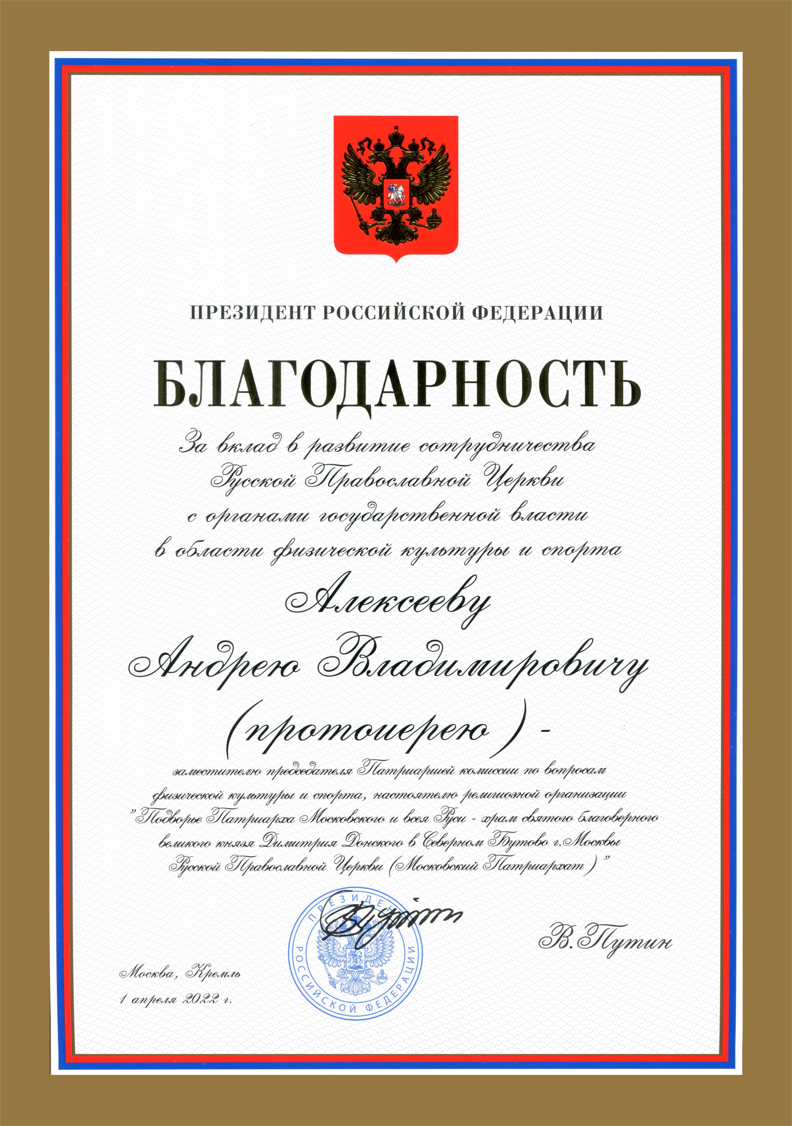 Сейчас в области спорта у нас ведётся большая совместная работа Церкви и государства, уже в течение восьми лет действует Патриаршая комиссия по вопросам физической культуры и спорта, которая активно занимается миссионерством в спортивном сообществе и воспитанием подрастающего поколения. И я со своей стороны хочу поблагодарить Святейшего Патриарха за благословение заниматься этой работой, а также Президента и Министра спорта нашей страны за высокую оценку наших скромных трудов.