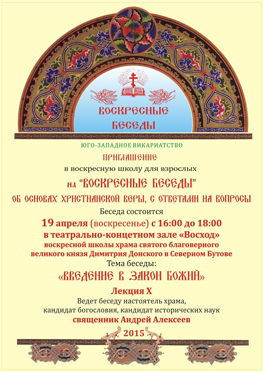 В воскресный день 19 апреля приглашаем вас в театрально-концертный зал «Восход» нашей воскресной школы на очередную, X-ю лекцию-встречу с настоятелем Подворья, иереем Андреем Алексеевым, в рамках цикла «Воскресные беседы об основах христианской веры».