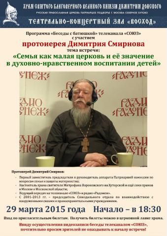 В воскресенье 29 марта в театрально-концертном зале «Восход» нашего Подворья состоится встреча с протоиереем Димитрием Смирновым в формате передачи «Беседы с батюшкой» телеканала «СОЮЗ».