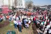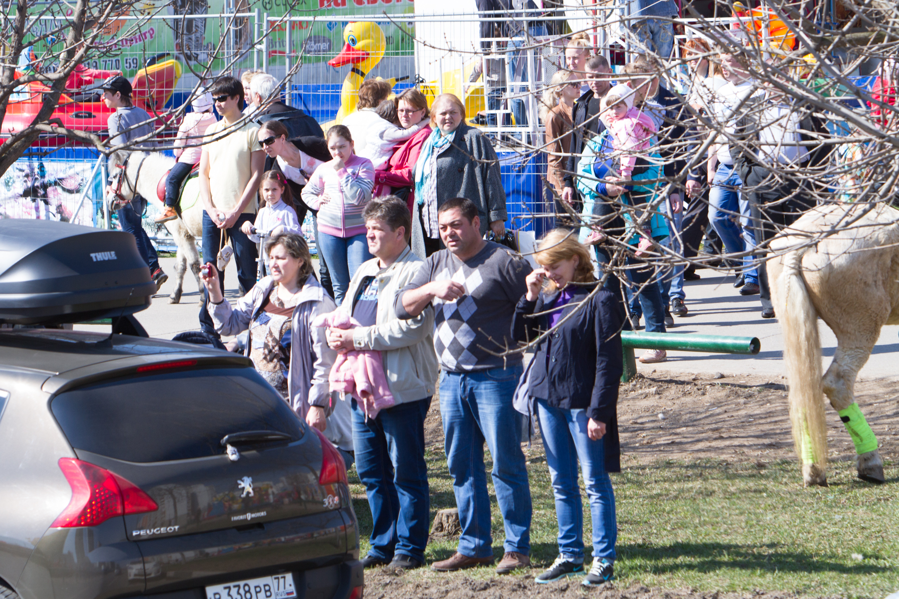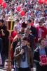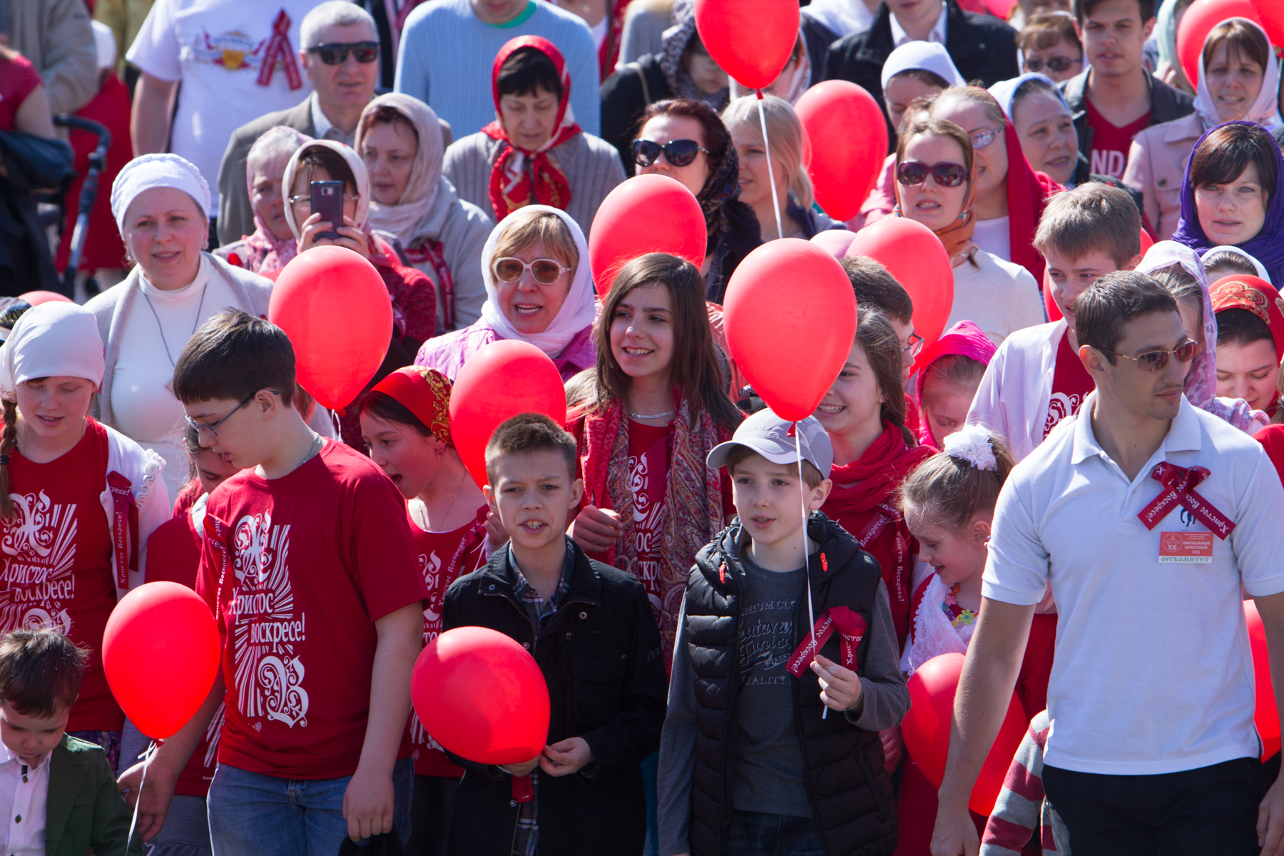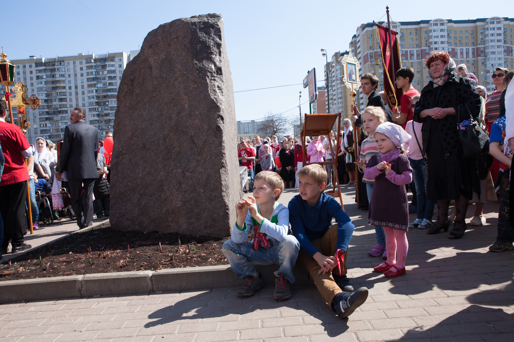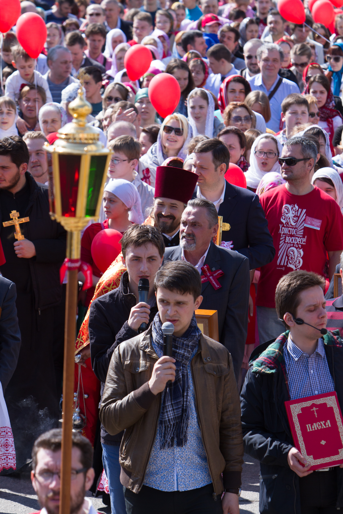 Продолжаются Пасхальные торжества и в нашем храме. После праздничного ночного богослужения в знак всеобщей радости и ликования на прихрамовой территории был устроен красочный фейерверк, а днём праздничные мероприятия продолжились большим крестным ходом к памятному камню в честь святого благоверного великого князя Димитрия Донского, расположенному в центре района, на мемориальной аллее возле метро. Это торжественное шествие – с иконами и хоругвями, под звуки пасхальных песнопений, под громогласные возгласы «Христос воскресе! – Воистину воскресе!!!» – стало видимым свидетельством живой веры и пасхальным благовестием для многих и многих жителей района. Они распахивали окна, выходили на балконы, останавливались на тротуарах, с интересом наблюдая за необыкновенной процессией, за сияющими лицами людей, спешащих поделиться с ними своей пасхальной радостью. А выражалась эта радость не только общим воодушевлением, но, конечно же, и традиционным пасхальным красным цветом: красные одежды, красные платочки, красные пасхальные ленточки и – дети в красных пасхальных футболках и с красными воздушными шарами в руках!