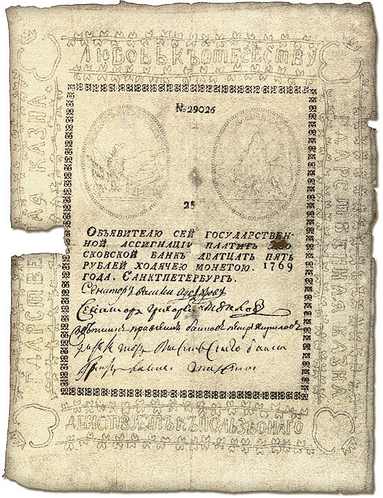 Для того чтобы избавиться от этих недостатков, в России было решено ввести бумажные деньги. В связи с этим 9 января 1769 года Екатериной II был подписан манифест о введении в России ассигнаций номиналом 25, 50, 75 и 100 рублей. Самые первые российские ассигнации хозяйственная Екатерина приказала изготовить из старых дворцовых скатертей и салфеток, которые таким необычным образом обрели вторую жизнь в новом благородном виде. Ассигнации напоминали титульный лист книги: вертикальный формат, изящные шрифты, одноцветная печать, ручного изготовления белая бумага с филигранью – фигурными водяными знаками. В центре красовался двуглавый орёл с распростертыми крыльями и цепью ордена Андрея Первозванного, но не коронованный. Слева полукругом шла относящаяся к орлу надпись – «Покоит и обороняет». Вверху была надпись «Любовь к отечеству», внизу – «Действует к пользе онаго». Справа была изображена неприступная скала, под ней – бушующее море и головы чудовищ. Над всем этим было написано «Невредима».