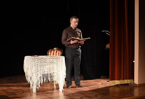 На сцене – покрытый скатертью стол и кресло для чтеца; на небольшом экране – графический портрет поэта; в полумраке зала – музыканты оркестра народных инструментов ансамбля «Вереюшка»… Скромный, сдержанный, даже несколько непривычный для нашего времени формат, не предполагающий яркой зрелищности и эффектности.