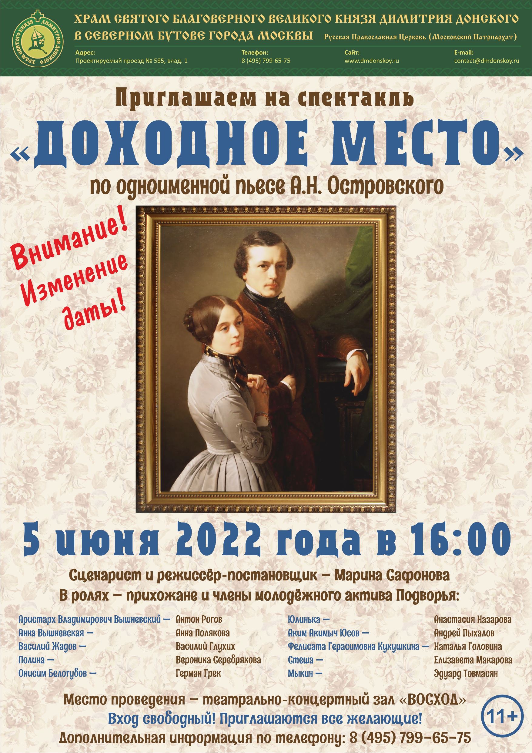 ВНИМАНИЕ! Перенос даты спектакля «Доходное место»! Постановка будет показана 5 июня!