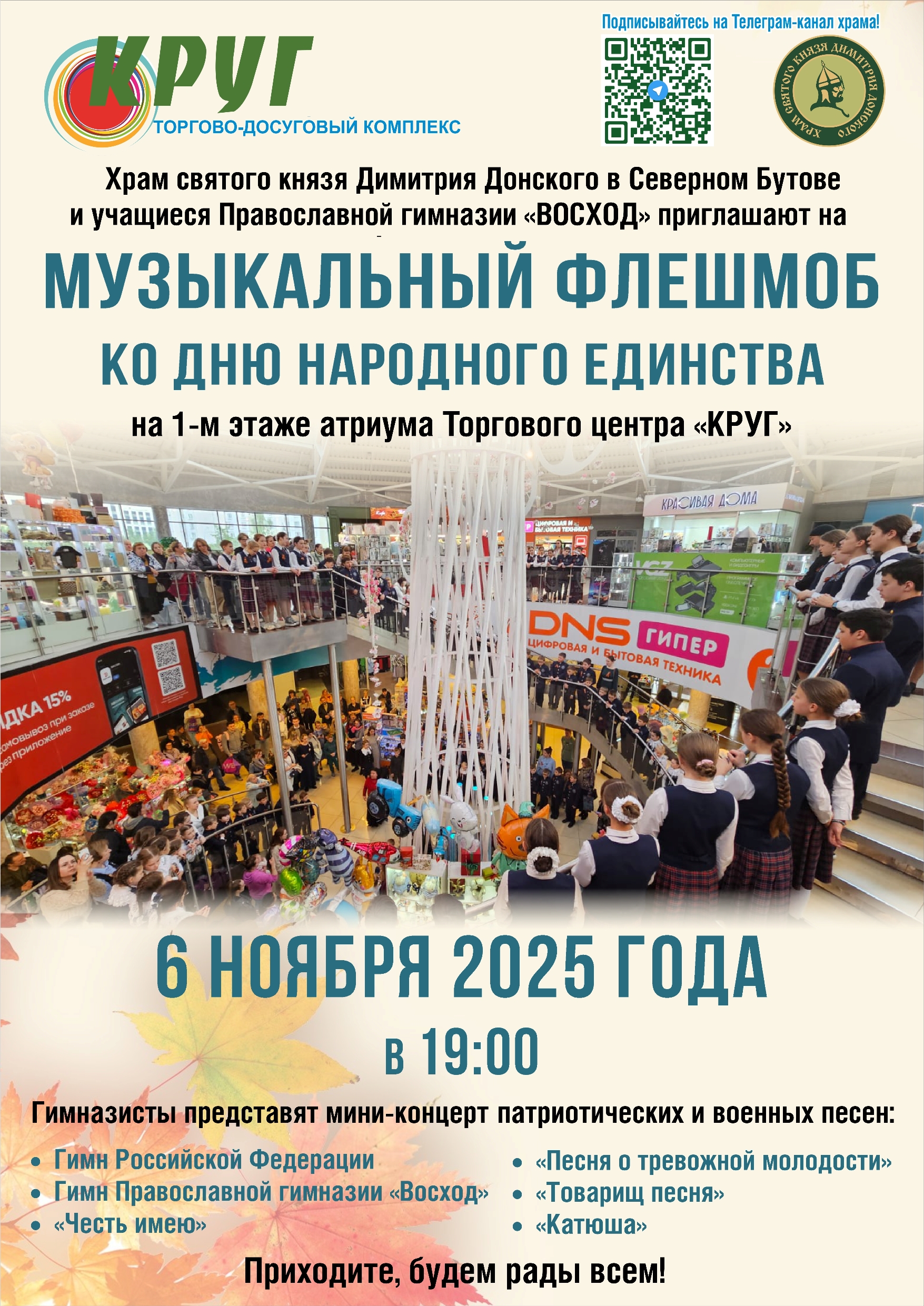 6 ноября 2025 года приглашаем вас на очередной музыкальный флэшмоб, который состоится в Торговом центре «КРУГ», в атриуме на 1-м этаже!