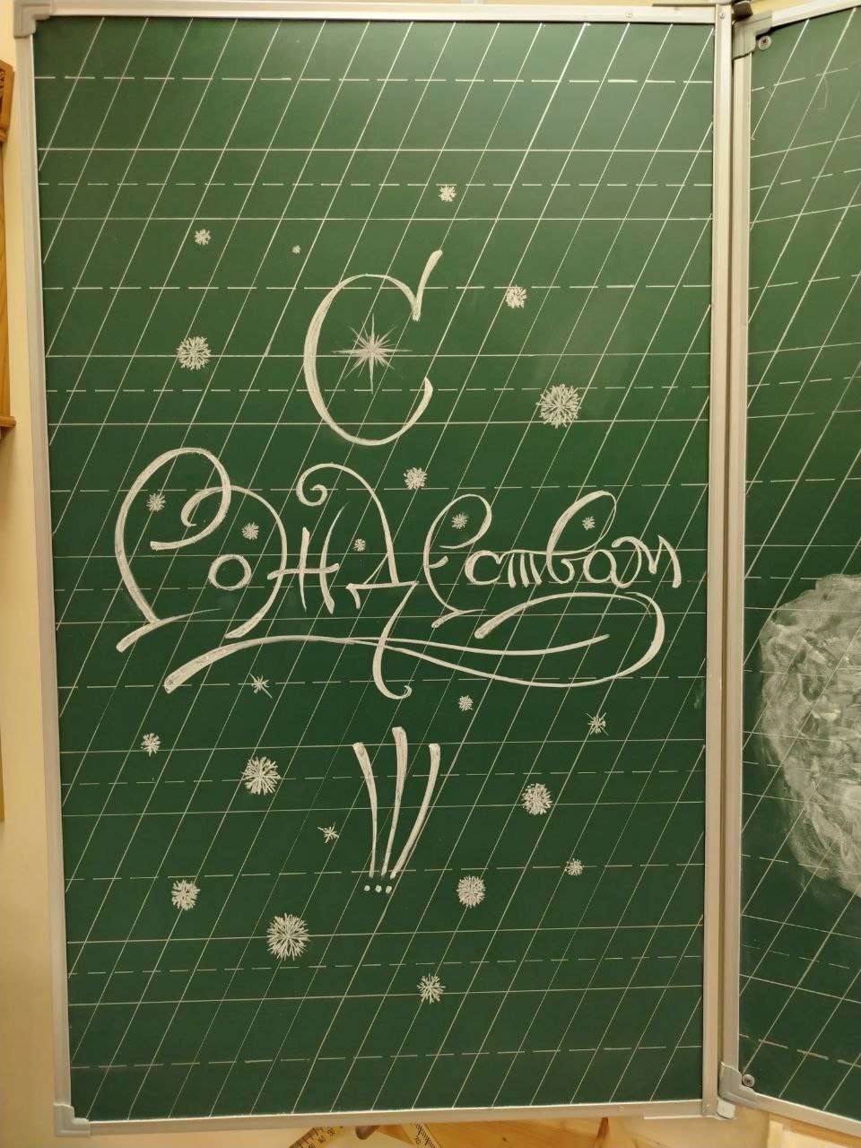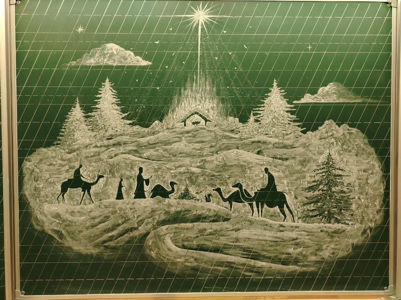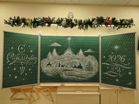 В дни новогодне-рождественских каникул преподаватель каллиграфии Анна Евгеньевна Чукмасова с помощью обыкновенного мела создала на школьной доске в одном из кабинетов удивительной красоты картину на рождественский сюжет.