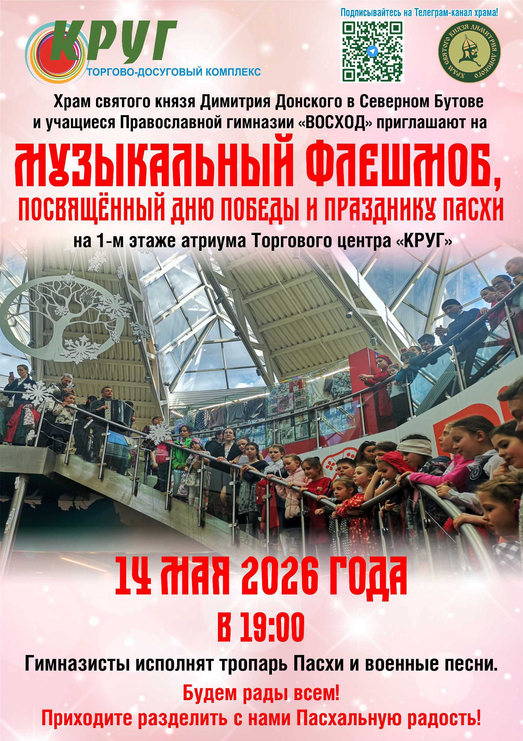 14 мая 2026 года, в период попразднства Пасхи Христовой, мы проведём на 1-м этаже атриума Торгового центра «КРУГ» традиционный музыкальный флэшмоб, посвящённый празднику Пасхи и Дню Победы!